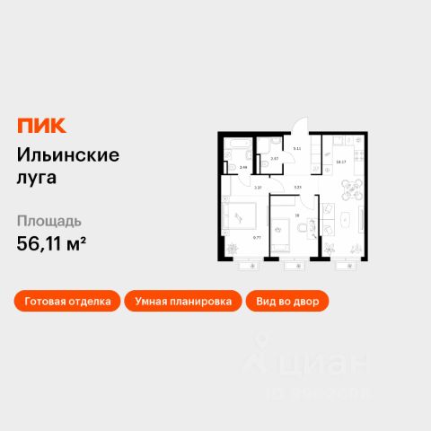 Продаётся 3-комнатная квартира 1768, площадью 52,79 м², на 17 этаже в ЖК "Ильинойс" корпус 3. Стоимость — от 15718232 руб. Квартира с отделкой, планировка односторонняя, окна на улицу.