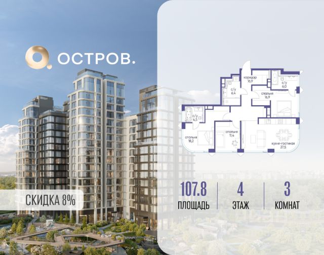 Продаётся многокомнатная квартира от застройщика: общая площадь 142.00 м², жилая 64.70 м², кухня 43.60 м², 16, жилой квартал "Остров 7", корпус 7 (7 квартал) (секция 1). срок сдачи: 4-кв. 2025. , 3 санузла: 1 раздельный и 2 совмещенных. В жилой зоне 2 больших окна на одну сторону, хорошая инсоляция. Позвоните сейчас и забронируйте квартиру! Купите квартиру в доме у прибрежного парка, в квартале ОСТРОВ.7. Это семь корпусов премиум- и бизнес-класса в одном из лучших мест ОСТРОВА - между бульваром и парком, поблизости от реки. Стильные корпуса имеют узнаваемый вид благодаря бионической пластике фасадов, приподнятых над землей. Для жителей предусмотрены детский клуб, фитнес-рум, коворкинг, переговорные, лаунжи. На крышах устроены видовые общественные пространства с зонами для отдыха и спорта. Двор расположен на двух уровнях: нижний ландшафтный парк и верхняя городская терраса. ОСТРОВ.7 - часть жилого комплекса на западе Москвы, в 15 минутах езды от центра. Это настоящий заповедник посреди большого города, в окружении реки и 650 га заповедников. Здесь все необходимое находится по соседству: от детского сада до супермаркета, от фитнес-зала до серфинг-центра. На территории созданы все условия для отдыха и общения: клубная инфраструктура в домах и дворы-парки, набережные и променады, маршруты для спортсменов, детей и возрастных жителей. В нескольких минутах ходьбы расположена станция метро "Терехово" БКЛ. На автомобиле - 10 минут до Москва-Сити и 15 минут до Садового кольца.