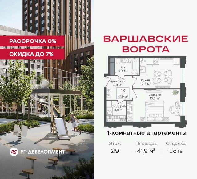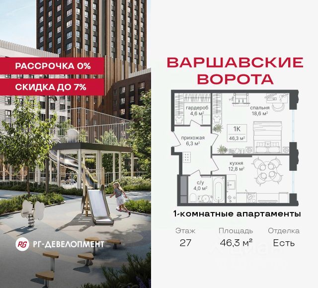 Рассрочка 0% + скидка 5%. Первый платёж 50% при ДДУ, второй 50% — через 12 мес. до ввода ЖК. Продаются 2-комнатные апартаменты 56,9 кв.м. в МФК "Варшавские ворота" на 6-м этаже 9 этажного дома. МФК "Варшавские ворота" — это проект, в котором учтен широкий спектр требований: от транспортной доступности и развитой инфраструктуры до архитектурной выразительности и экологического окружения. Апартаменты в МФК "Варшавские ворота" подойдут для тех, кто ищет продуманное жилье в Москве или готовый инвестиционный актив. Апартаменты здесь — это: - возможность жить комфортно в удобном городском формате — с природой, метро, сервисом и паркингом; - возможность купить лот с готовой отделкой, чтобы вложить минимальные инвестиции в ремонт и получить максимум возможностей от сдачи; - экономия на налоге на имущество, кадастровая стоимость апартаментов ниже ~ на 30% кадастровой стоимости квартиры; - высокая инвестиционная доходность объекта за счет более низкой цены покупки по сравнению с квартирой. Коротко о важном: - 1 минута пешком от м. Аннино; - Удобные выезды на Варшавское шоссе и МКАД; - Вид из окон на Битцевский лес и Аннинский лесопарк; - Высота потолков 2,7 - 3 м; - Закрытый двор-парк; - Школы и детские сады в 10-15 минутах пешком от дома; - Технические лоджии для размещения кондиционеров; - Подземный паркинг; - РГ-Девелопмент — ТОП-20 крупнейших застройщиков России. Проект сочетает в себе современную архитектуру и продуманное благоустройство с уникальным природным окружением. Всего в нескольких минутах от дома — девять парков, каскад прудов и крупнейшие лесопарковые зоны Москвы, создающие ощущение жизни в зеленом оазисе посреди мегаполиса. Архитектурная концепция - стиль Чикаго в Москве. Выполнена в минималистичной эстетике с использованием клинкера и декоративного кирпича. Фасады подчеркивают строгие линии и современный стиль, а входные группы разработаны московским бюро Syntaxis. Лобби оформлены с применением керамогранита, декоративной штукатурки и гипсовых панелей, детали из латуни добавляют изысканности. Пространство оживляют гербарии, композиции из сухоцветов и авторские панно. Проект находится в одной минуте пешком от метро "Аннино", в 12 минутах от станции "Улица Академика Янгеля" и рядом с МЦД-2 "Красный Строитель". Для автомобилистов предусмотрен прямой выезд на Варшавское шоссе и два съезда на МКАД, что позволяет быстро добираться в любую часть города. Среди планировочных решений представлены разнообразные форматы: от функциональных студий до просторных 4-комнатных квартир и апартаментов площадью от 22 до 105 м². Высокие потолки усиливают ощущение простора, а продуманные планировки включают мастер-спальни, гардеробные, угловые окна, объединённые кухни-гостиные и несколько санузлов. Центральное пространство комплекса — закрытый двор без машин. Он разделён на функциональные зоны: детские игровые комплексы, спортивные площадки, воркаут-зоны и уютные места для тихого отдыха. На первых этажах разместя Продам квартиру с отделкой от застройщика рядом с метро Улица Академика Янгеля.