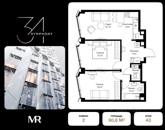 Дом сдан. Ключи в день покупки! В продаже 2-комнатная квартира площадью 59.50 м² с предчистовой отделкой на 38 этаже 43 этажного дома в корпусе Сильвер. ЖК Симфония 34 - концептуально новый жилой комплекс премиум-класса с подземной парковкой, состоит из четырех башен высотой 36 - 54 этажа. Квартиры сдаются с базовой (предчистовой) отделкой MR BASE или дизайнерской чистовой отделкой MR READY. Высота потолков 3 - 6 метров, окна высотой до 2,6 м. Более 100 кладовых в подземной части ЖК и более 500 на этажах. Безопасность - Система контроля входа на территорию комплекса, биометрия - Система автоматического водяного пожаротушения и противопожарного водопровода, система пожарной вентиляции - Доступ на парковку при помощи системы распознавания автомобильных номеров, карточка для контроля доступа резидентов - Система видеонаблюдения - Круглосуточная связь через приложение, телефон, голосовые сообщения с охраной, консьержем, call-центр. Расположение Пешком - 6 минут до метро "Дмитровская" - 15 минут до Тимирязевского парка На машине - 5 минут до Савеловского вокзала и Аэроэкспресса в Шереметьево - 10 минут до Москва-Сити и Садового кольца Благоустройство - 70% территории отведены под зеленые насаждения и ландшафтный дизайн - Приватный Японский сад - Детские площадки с зонированием по возрасту - Clubhouse для резидентов - Wellness & SPA - Зона для пикника, зона с гамаками - Центральное лобби, ресторан, коммерческие помещения - Дополнительный вход/выход на территорию комплекса Окружение - В 10 минутах от Symphony 34 находится дизайн-завод Flacon, где регулярно проходят культурно-образовательные и развлекательные мероприятия - Тимирязевский парк расположен в 850 м. Площадь парка 232 га - Рядом расположен парк "Дубки", площадью 16,5 га. - В 15 минутах расположен Хлебозавод 9. Здесь находятся шоурумы брендов, кафе разных кухонь мира, образовательные проекты и площадки для мероприятиКомпания MR предлагает своим клиентам специальные условия приобретения квартир в рамках программ ипотечного кредитования от банков-партнеров. Продается квартира от застройщика в округе САО в Москве.
