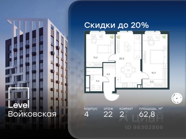 Цена указана с учётом скидки при 100%-й оплате, несубсидированной ипотеке, рассрочке (кроме программы "Рассрочка 0%"). Продается 2-комнатная квартира площадью 62.80 кв. м с отделкой. Квартира находится на 22 этаже 26-этажного корпуса 4, в новом жилом комплексе бизнес-класса Level Войковская, расположенном рядом с живописным заповедником "Покровское-Стрешнево" (застройщик - компания Level Group/Левел групп). Прекрасная транспортная доступность - 7 мин. пешком до станции МЦК "Балтийская"; - 15 мин. пешком до станции метро "Войковская"; - 8 мин. на машине до ТТК; - 15 мин. на машине до центра Москвы; - 20 мин. на машине до Москва-Сити. Продуманный архитектурный проект - стильная архитектура от мастерской Фефелова В. В.; - панорамные виды на парки, Химкинское водохранилище и Останкинскую башню; - лобби с высотой потолков до 6,45 метров; - более 20 видов планировочных решений, включая редкие форматы квартир с террасой и увеличенной высотой потолков до 5,42 метров; - 2 варианта дизайнерской отделки в корпусе 4, предлагаются как дополнительная опция к отделке white box: стиль Modern в светлых холодных тонах и стиль Classic в нейтральной бежевой гамме. Квартиры в корпусах 3 и 5 сдаются без отделки. Расположение Level Войковская строится в престижном Северном округе Москвы. Развитая инфраструктура и живописная природа переплетаются в единый ансамбль, столь значимый для комфортной жизни. Войковский район окружают парки и набережные. В шаговой доступности - парк "Покровское-Стрешнево", не более 15-ти минут на велосипеде занимает путь до Тимирязевского парка и 9-ти минут до парка усадьбы Михалково. Рядом более 60 школ, 75 дошкольных учреждений, 17 государственных и 6 частных вузов, 25 супермаркетов, 4 торговых центра, среди которых ТЦ "Метрополис" и ТЦ "Авиапарк". Внутренняя инфраструктура На территории жилого комплекса предусмотрены коммерческие помещения: кафе, ресторан, пекарня и другие сервисы откроются на первых этажах корпусов. Для жителей будет доступен отапливаемый подземный паркинг на 244 машино-места с доступом с любого этажа на лифте. На территории паркинга будет расположено 125 кладовых помещений для хранения сезонного инвентаря. Лобби и благоустройство Дизайн лобби Level Войковская создан совместно с бюро BLANK. Это уютные гостиные, где хочется задержаться. Теплая цветовая гамма, ресепшен, зоны ожидания, лапомойки и гостевые санузлы - каждая деталь превращает лобби в комфортное продолжение вашего дома. 1,15 га площади в первых двух этапах строительства отведено под приватный внутренний двор, который спроектирован совместно с бюро "Правда". Детские площадки для всех возрастов, спортивные пространства для йоги, воркаута и петанка, уютные зоны для тихого отдыха или работы. Здесь утро начинается с вдохновения, а вечер наполнен приятными моментами. Лифты Комфортное перемещение внутри жилого комплекса будут обеспечивать надёжные лифты с доступом в паркинг с жилых этажей. В каждом корпусе предусмотрено по 3 грузопассажирских лифта.