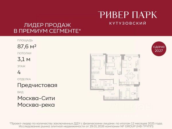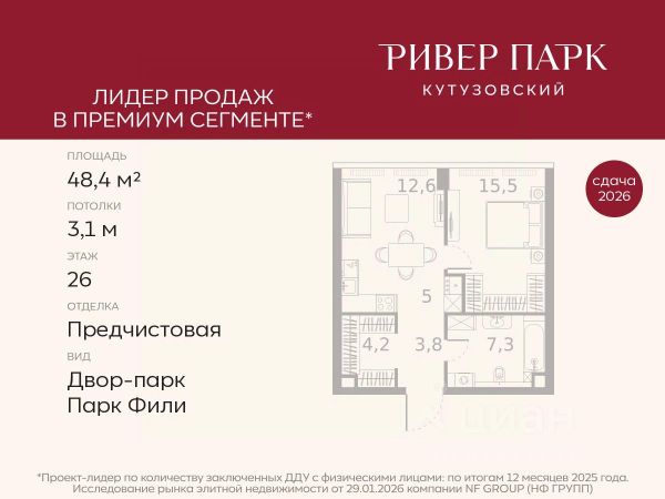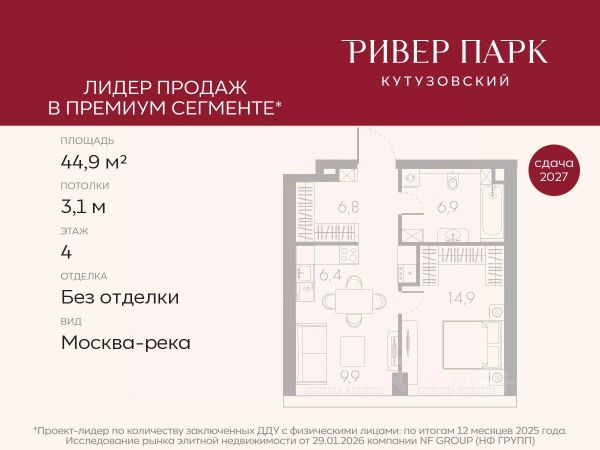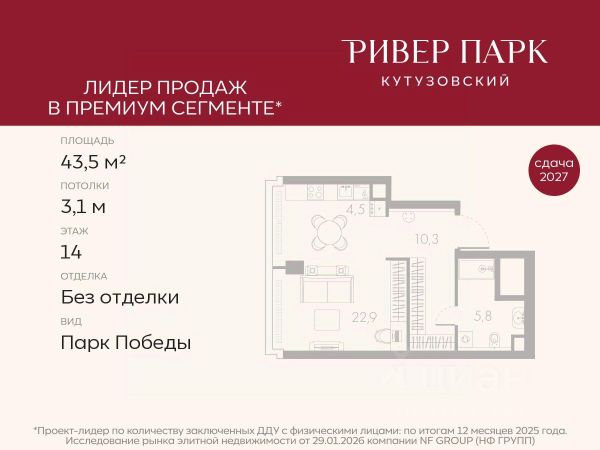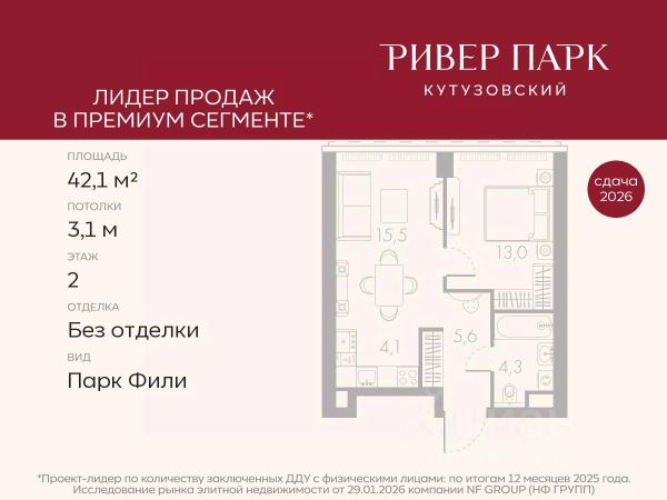 Продается 1-к квартира площадью 42.1 кв.м. на 2-м этаже в жилом комплексе премиум-класса Ривер Парк Кутузовский в Башне Янтарь Премиальный жилой комплекс Ривер Парк Кутузовский строится в одном из самых престижных районов столицы Дорогомилово, на берегу Москвы-реки с лучшими видами на Москва-Сити. Яркий проект в стиле эко-футуризма станет самым масштабным и самым высотным ЖК в локации Кутузовского проспекта. Расположение и Транспортная доступность: • На берегу Москвы-реки, напротив Москва-Сити • 600 метров до Кутузовского проспекта • Удобный съезд с ТТК • Прямой выезд на МКАД по Проспекту Багратиона. • В пешей доступности 3 станции метро: Фили, Парк Победы, Кутузовская, а также станция МЦД Фили. Архитектура от именитого бюро ADM отличается уникальной пластикой фасадов - башни словно парят в воздухе, играя гранями как драгоценные камни. Жилой комплекс состоит из 5-ти небоскребов с приватным парком 2 Га и внешней торговой галереей с открытым доступом. В закрытом внутреннем дворе уникальная по насыщенности клубная инфраструктура только для жителей: • Площадка Мультиспорт (баскетбол, футбол, воллейбол, большой теннис) • Детский игровой клуб Немо • Музыкальная студия • Клуб Гедонист с бильярдной • Студия стиля для стилистов и массажа • Гольф-симулятор • Караоке Впервые в Москве лаунж-зоны на крыше небоскребов, только для жителей: • Всесезонные беседки иглу • Джакузи • Гриль • Площадка для занятий йогой • Самые высоки качели на крыше в России • Видовые площадки Благоустройство комплекса занимает 3 гектара и разработано мировым экспертом по городским парковым ландшафтам - голландским бюро WEST8. Концепция проекта дать жителям отдохнуть от городского ритма и расслабиться среди природы. В Приватном парке уже высажены хвойные деревья-крупномеры сосны и ели. • Зеркальный пруд с арт-объектом • Две детские площадки • Точка спорта с тренажерами и турниками • Цветущий сад • Зеленый театр со сценой и проектором • Видовая зона отдыха с очагом • Солнечная терраса с лежаками На территории жилого комплекса планируется строительство коммерческого образовательного центра, включающего детский сад на 200 мест и школу на 460 мест.