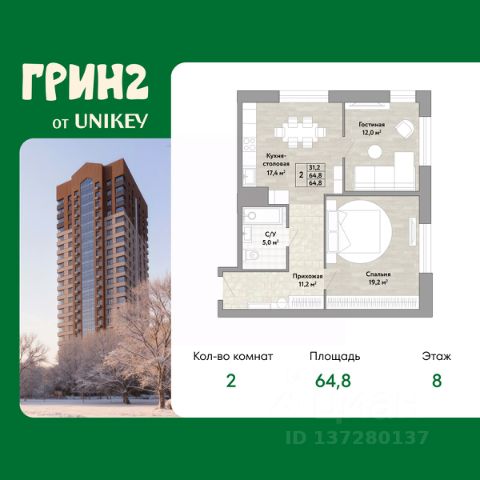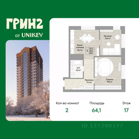 В жилом комплексе, расположенном по соседству с ландшафтным парком "Южное Бутово", продается 2-комнатная квартира площадью 63.80 кв. м. без отделки. Квартира расположена на 2 этаже 1 корпуса в жилом квартале комфорт-класса "Новые Смыслы" (ГК Unikey/Юникей). Доступная и удобная локация: - 10 минут ходьбы до станции метро "Потапово". - 25 минут ходьбы до станции метро "Бунинская аллея". - 15 минут на авто до Калужского шоссе. - 20 минут на авто до МКАД. - 30 минут на машине до аэропортов "Внуково" и "Остафьево". Продуманный архитектурный проект: - Разноуровневые секции с эстетичные башнями и контрастными цветовыми сочетаниями, напоминающими башни в Сити. - Сказочные виды из окон на современный район столицы. - Авторские планировки с потолками в 3 метра, просторными кухнями-гостиными и мастер-спальнями. - Комфортные бесплатные общественные пространства. - Подземный паркинг с прямым доступом на лифте. - Настоящий лес с живописными пейзажами и прудом прямо во дворе. Расположение Комплекс "Новые Смыслы" расположится в благоприятном районе Новой Москвы - Коммунарка. Зеленое окружение, богатая инфраструктура развивающегося района - все это сформирует особое пространство для комфортной жизни, наполненной смыслом. 10 минут на велосипеде - и вы в ландшафтном парке "Южное Бутово" или сквере у Потаповских прудов. Чуть дальше расположен Бутовский лесопарк. В окружении "Новых Смыслов" вы найдете все необходимые социальные объекты. В двух шагах от дома находится 5 школ, более десятка детских садов, секции для занятий малышей и подростков, частные клиники, супермаркеты, рестораны, студии красоты и фитнес-центры. За 12 минут на авто вы доберетесь до ледовой арены, комплекса "Спорт Станция" и спа-центра "Termoland". Внутренняя инфраструктура Для жителей "Новых Смыслов" будут созданы бесплатные общественные пространства: - Деловая гостиная с эстетичным коворкингом и переговорными. - Гостиная для души и тела, включающая фитнес-зону с тренажерами и пространства для стретчинга, йоги и медитаций. - Гостиная детства, где дети будут играть и развиваться под присмотром тьютора. - Кино-гостиная - кинотеатр на крыше одного из домов, предлагающий разнообразную программу. - Прачечная, работающая только для жильцов. Вместе с корпусами комплекса на территории запланировано строительство детского сада. На первых этажах корпусов откроются кофейни, пекарни, сервисы быта и пункты доставки. Благоустройство Чтобы отдохнуть от суеты города, достаточно выйти во двор: здесь раскинулся настоящий лес с живописными пейзажами. В тени деревьев жителей ждут пруд с мостиком и беседкой на берегу, тихие прогулочные аллеи, спортивная площадка и зоны для занятий йогой и бадминтоном на свежем воздухе. Юных жителей порадуют современные детские площадки, жукарий и специальное пространство для подвижных игр. Безопасность на территории гарантирована: двор огорожен от машин и оснащен камерами видеонаблюдения.