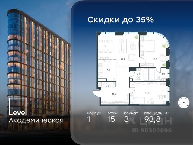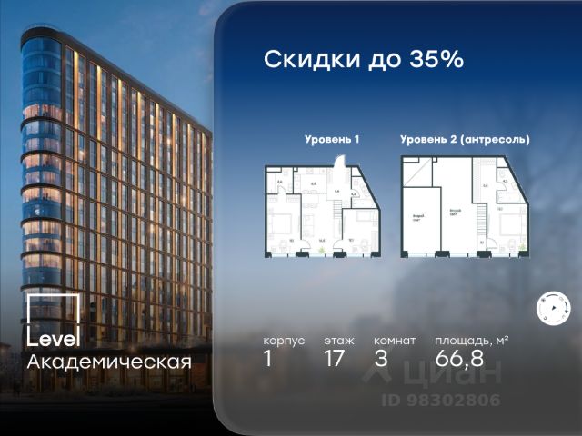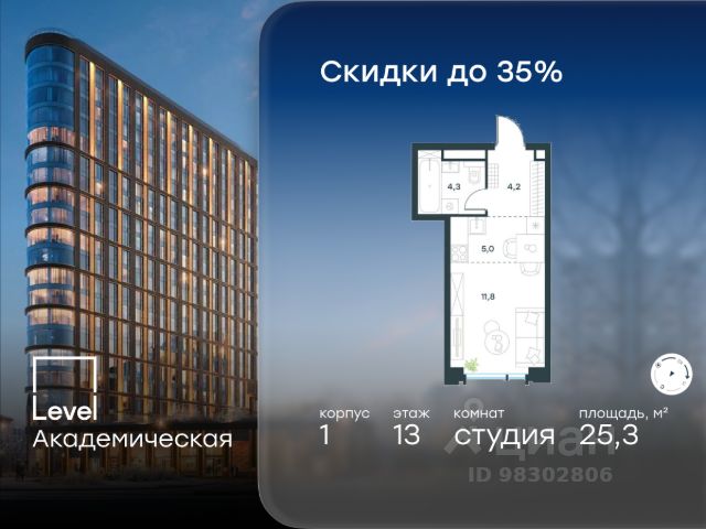 Цена указана с учётом скидки при 100%-й оплате, несубсидированной ипотеке, рассрочке (кроме программы "Рассрочка 0%"). В Академическом районе продаётся квартира-студия площадью 24.80 кв.м без отделки. Квартира расположена на 13-м этаже 19-этажного жилого комплекса бизнес-класса Level Академическая (компания Level Group). Отличная транспортная доступность: - 1 мин. пешком до станции метро "Академическая"; - 4 мин. на автомобиле до ТТК; - 8 мин. на автомобиле до Садового кольца; - 13 мин. на автомобиле до Кремля. Продуманный архитектурный проект: - современная архитектура от бюро UNK project; - высокие потолки в квартирах до 6,62 м; - окна в пол высотой 2,5-2,68 м с панорамным видом на МГУ, Москва-Сити и другие доминанты Москвы; - квартиры с моллированным остеклением - радиусные окна открывают увеличенный угол обзора; - более 20 вариантов планировочных решений; - уникальные квартиры с собственным патио и возможностью обустройства дровяного камина; - квартиры сдаются без отделки, что открывает свободу для создания интерьера по своему вкусу. Расположение: Камерный проект из 1 корпуса расположен тихом зеленом районе Москвы, в непосредственной близости к центру города. В округе построено 80 детских садов, 50 школ и 30 вузов, 7 из которых входят в топ100 вузов России: МГУ, МГИМО, РАНХиГС, МИСИС, РУДН, РЭУ им. Плеханова и РГУ нефти и газа им. Губкина. Этот район буквально утопает в зелени парков, начиная с уютного Академического в 6 минутах пешком и заканчивая одним из крупнейших в городе парком 50-летия Октября (12 минут на автомобиле). Общая площадь природных объектов в радиусе 2-6 км от дома - 476,5 га. Внутренняя инфраструктура: На территории Level Академическая откроется собственный торговый центр, а для отдыха жителей будут созданы общественные пространства: комфортное лобби с дизайнерской отделкой, окнами в пол и потолками высотой 4,5 м, а также две благоустроенные зоны - территория по периметру здания и пространство на стилобате. Во дворе на стилобате предусмотрены детская и спортивная площадки, коворкинг и лаунж-зона на открытом воздухе. Стилобат украсят скульптуры животных - жирафа, зайца и волка, которые станут ярким акцентом внутреннего двора Level Академическая, подчеркивая близость к музею Дарвина. Процент озеленения территории - 58%. Технологии и безопасность: Жителей Level Академическая не коснется ежегодное отключение горячей воды благодаря собственным центральным водонагревателям. Безопасность гарантирует круглосуточная охрана, безлимитный Wi-Fi, круглосуточное видеонаблюдение. Удобное перемещение внутри комплекса будут обеспечивать 5 лифтов с доступом в паркинг с жилых этажей. Продам квартиру от застройщика в районе Академический в Москве.