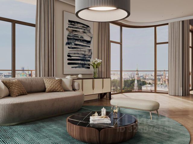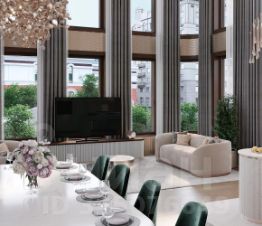 Единственная квартира в доме с отделкой и мебелью, её площадь 201,5 кв. м. Дизайн пространства разработало международное архитектурное бюро Олега Клодта. Продуманная планировка разделена на две зоны. В парадной части расположена кухня-гостиная площадью 85 кв. м, гостевой санузлел и прихожая, а в приватной - три спальни. Из панорамных окон просторной кухни-гостиной открываются впечатляющие прямые виды на Кремль, храм Христа Спасителя и Москва-Сити. Панорамные окна спален выходят в тихий приватный двор-парк с живописным ландшафтным дизайном, фонтаном и ручьём. В каждой спальне свой санузел и гардеробная.