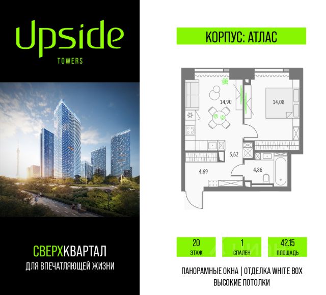 Продаётся студия площадью 22.99 кв.м на 11 этаже 47 этажного корпуса Атлас в квартале небоскребов "Upside Towers". В квартире отделка White-box, c видом на корпус Эльбрус, прогулочный бульвар. Номер квартиры Б1103. Upside Towers - технологичный квартал строится в динамично развивающемся Бутырском районе, в 3 мин. от метро, в 5 мин. от ТТК. На территории 7 га возводится 5 высотных башен от 19 до 58 этажей, названных в честь главных вершин земли. Квартиры с панорамными окнами в пол, высокими потолками и современными инженерными решениями. Благоустроенная зеленая территория включает: приватные дворы, природный комплекс, прогулочный бульвар, ландшафтный парк 2,5 га с сенсорным садом и многофункциональными игровыми и спортивными площадками. В корпусе откроются магазины, кафе и рестораны, а также другие объекты коммерческой инфраструктуры. На последнем этаже корпуса предусмотрен SPA Relax центр с панорамным видом на город. Собственники квартир смогут в любое удобное для них время забронировать посещение спа-зоны через смарт-приложение. Дня них будут доступны джакузи, пространства для занятий йогой, а также места для отдыха и релаксации. Большое внимание в проекте уделяется созданию социальной инфраструктуры. Между "Атласом" и "Олимпом" в трехэтажном стилобате разместится уникальное пространство закрытый клуб для жителей квартала Upside Club площадью 2 000 кв. м. Здесь появится каминный зал с роялем, многофункциональная детская зона c двухуровневым игровым оборудованием для малышей и дошкольников, плей-рум для подростков, домашний кинотеатр, коворкинг, переговорные и лектории. На крыше стилобата разместится всесезонная BBQ патио-зона с верандой и закрытыми помещениями для приготовления и отдыха. В башнях откроются смотровые террасы для резидентов с панорамными видами на город, парки, Останкинскую башню, ВДНХ, Ботанический сад и Москва-Сити. Покупая квартиру даже самого минимального размера в Upside Towers, вы получаете в пользование 2 000 м² бесплатных общественных пространств. В рамках проекта строится государственная школа и детский сад, разместится более 15 000 кв.м. коммерческой инфраструктуры. Насыщенная социальная инфраструктура формирует множество сценариев для жизни на территории квартала. В Upside Towers применяются лучшие технологии и практики, чтобы обеспечить высшее качество жизни: Воздух, не уступающий по качеству горному, обеспечит приточно-вытяжная вентиляция. Пятиступенчатая очистка воды с сохранением полезных минералов. Центральное кондиционирование. Внутрипольные конвекторы с естественной конвекцией. Современные системы безопасности и мониторинга микроклимата. Высокоскоростной интернет на всей территории, в квартирах и паркинге за счет усиления GSM-связи всех ведущих операторов. Все места в подземном паркинге оборудованы зарядками для электрокаров. Бутырский район непрерывно развивается и готовится стать новым современным деловым районом Москвы. В рамках программы "Индустриальные кварталы" комплексного развития территори Продам квартиру от застройщика в районе Бутырский в Москве.