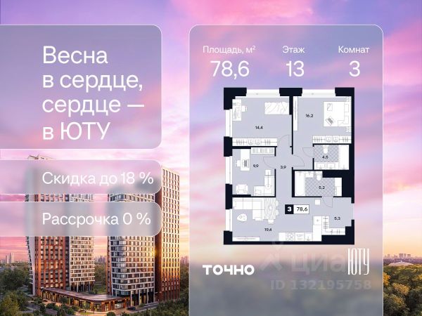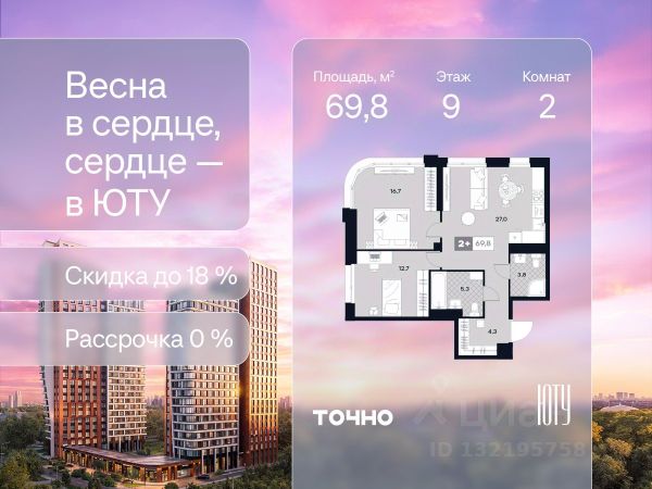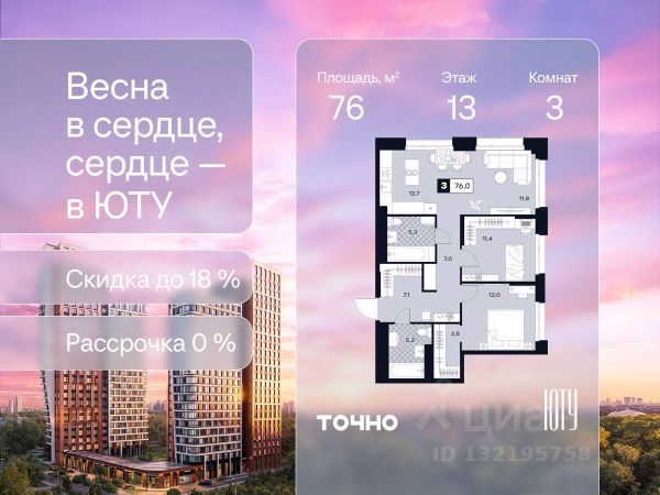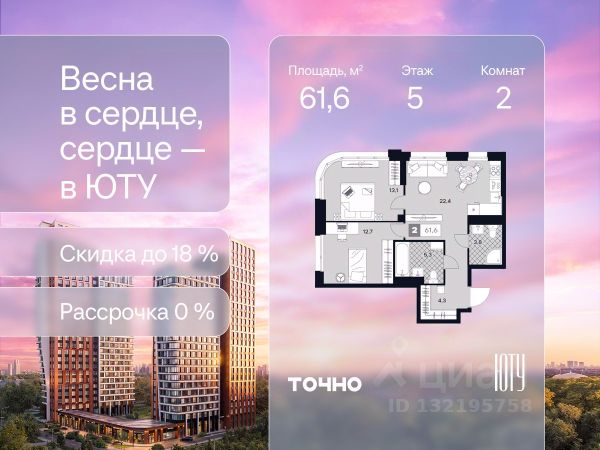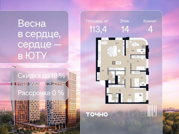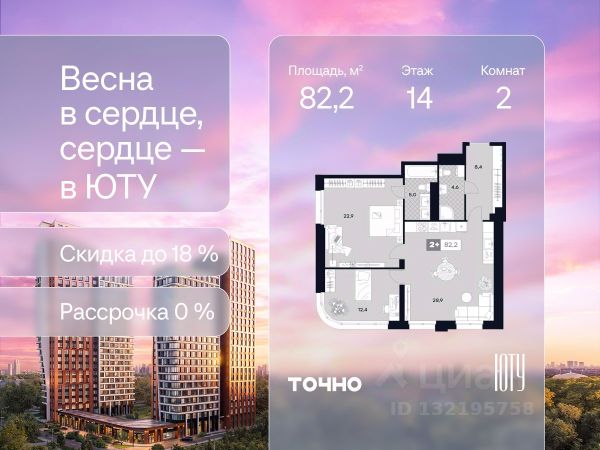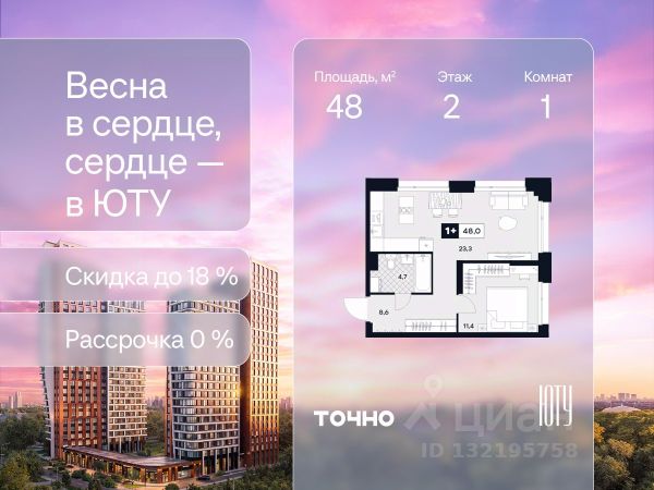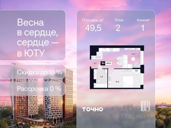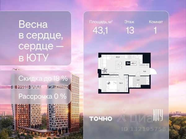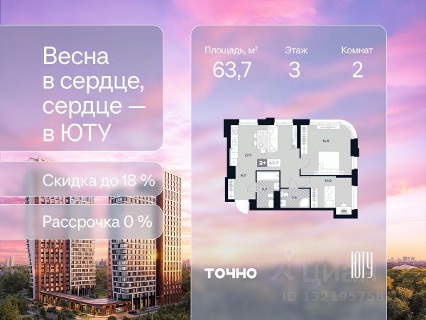 Скидка до 18% в апреле на выделенный пул лотов! ЮТУ — камерный проект бизнес-класса с исключительной архитектурой, видовыми квартирами и подходом к большой благоустроенной набережной канала имени Москвы. Проект создает идеальный баланс жизни в городе. Это приватный оазис, где в любой момент можно сменить обстановку и выбрать любой из тысячи маршрутов к активному отдыху и ярким впечатлениям. Удачное месторасположение: • Первая линия в прибрежной части Химкинского водохранилища • Исключительно тихий и зелёный район Южное Тушино • За 2 минуты можно спуститься к воде, за 10 минут найти зеленые парки и готовую инфраструктуру, за 30 минут доехать до Кремля Концепция проекта: • Две футуристичные башни, соединенные торговой галереей от бюро ATRIUM • 60 неповторяющихся планировок: квартиры с угловым панорамным остеклением, мастер-спальнями и гостиными до 39м², а также просторные квартиры площадью до 128,6 м² Чувство эксклюзивности: • Своя приватная жилая экосистема только для резидентов домов • Лаунж-терраса на крыше • В проекте предусмотрен закрытый двор-парк. Прогрессивные технологии: • 3-х уровневая система безопасности (Face ID, BLE-метки, видеонаблюдение) • Умный паркинг с распознаванием номеров Проект федерального девелопера ТОЧНО, который входит в ТОП-5 девелоперов России по объемам строительства.