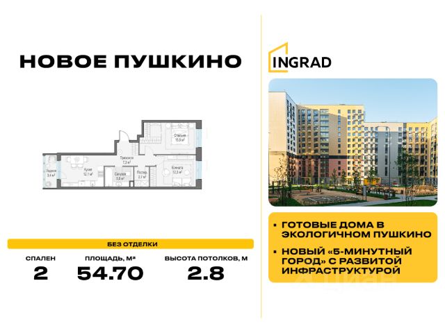 Прямая продажа от девелопера. В жилом квартале комфорт-класса "Новое Пушкино" (девелопер Ingrad) продаётся 2-спальная квартира площадью 54.70 кв.м без отделки. Квартира расположена на 11 этаже 14-этажного дома, корпус 23. Расположение и окружение: Жилой квартал "Новое Пушкино" расположен в экологичном городе Пушкино. Рядом с кварталами расположены: Северный лесопарк - 650 м, пушкинский ЦПКиО - 1 км, дендрарий - 1 км, ферма-экопарк "Птичник" - 1,2 км, парк "Серебрянка" вдоль одноимённой реки - 3,5 км. В окрестностях есть большие водоёмы и лесные массивы, где можно загорать, плавать и наслаждаться пикником на берегу. Отличная транспортная доступность: До Ярославского шоссе, по которому можно добраться до МКАД, всего 3 км. Важным пунктом развития инфраструктуры станет строительство Мытищинской хорды (Северного дублёра МКАД). Железнодорожные станции Заветы Ильича и Пушкино расположены в 1,5 км и 3 км.. Инфраструктура: "Новое Пушкино" - новый "5-минутный город" с собственной развитой инфраструктурой, где всё необходимое находится в пределах пяти минут пешей прогулки. Район уже полностью сложился: социальные и сервисные объекты функционируют, обеспечивая жителям высокий уровень комфорта и удобства. В нём уже построено 29 домов, работают два детских сада и школа. Свой прогулочный бульвар протяжённостью более 500 м располагает пространствами для отдыха, занятий спортом и встреч с друзьями. Здесь есть велосипедные дорожки, воркаут-зоны, теннисные столы и детские площадки. На первых этажах домов открыты кафе, магазины и сервисы, которые упрощают повседневные дела. Запланировано строительство торгового центра. Стоимость квартиры - 10 980 000 Р. Срок сдачи - 3 квартал 2025. Более подробную информацию по объекту уточняйте по телефону и в отделе продаж.