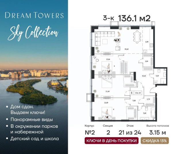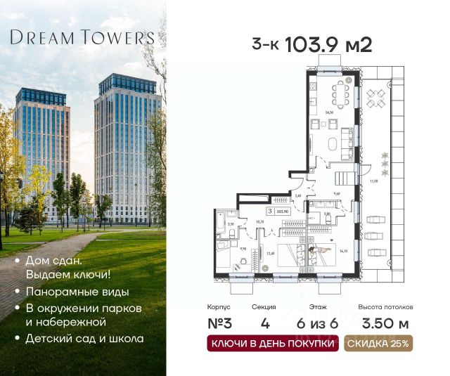 Рассрочка 0% от застройщика. Ключи в день покупки. ЖК Dream Towers проект премиум-класса в окружении парков и набережной, с полностью готовой инфраструктурой для комфортной жизни и отдыха. Продаётся 2-квартира на 6 этаже 6-этажного дома (3 корпус). Общая площадь: 57.1 кв.м. Высота потолков от 3.50 м. Город-курорт на 100 Га в шаге от вашего дома: - пляжный комлекс Dream Beach Club; - парк аттракционов Остров Мечты; - 44 Га ландшафтных парков; - пешеходная набережная; - яхт-клуб; - Южный речной вокзал; - вейк-парк и многое другое. В Dream Towers предусмотрено все для комфортной жизни с семьей: - дизайнерские лобби с общественной гостиной, колясочной и лапомойками; - охраняемый благоустроенной двор только для жителей; - собственный десткий сад и школа прямо во дворе; - красивая архитектура зданий в стиле Ар-деко; - облицовка фасадов из натурального камня с архитектурной подсветкой; - широкоформатное остекление окон в пол для лучших видовых характеристик на парки и пойму Москвы-реки; - подземный паркинг; - клубный формат проживания; - эргономичные планировки от 40 до 162 м2; - высокие потолки от 3,15 до 4,1 м; - квартиры с террасами; - вся необходимая инфраструктура на первых этажах домов, а также в торговой части тематического парка "Остров Мечты" (рестораны, кафе, супермаркет, магазины, салон красоты, йога-студия и многое другое). Центр рядом: 15 минут до Садового кольца на авто, 20 минут до Сити или Кремля. В 5 минутах прогулочным шагом — станция метро "Технопарк".