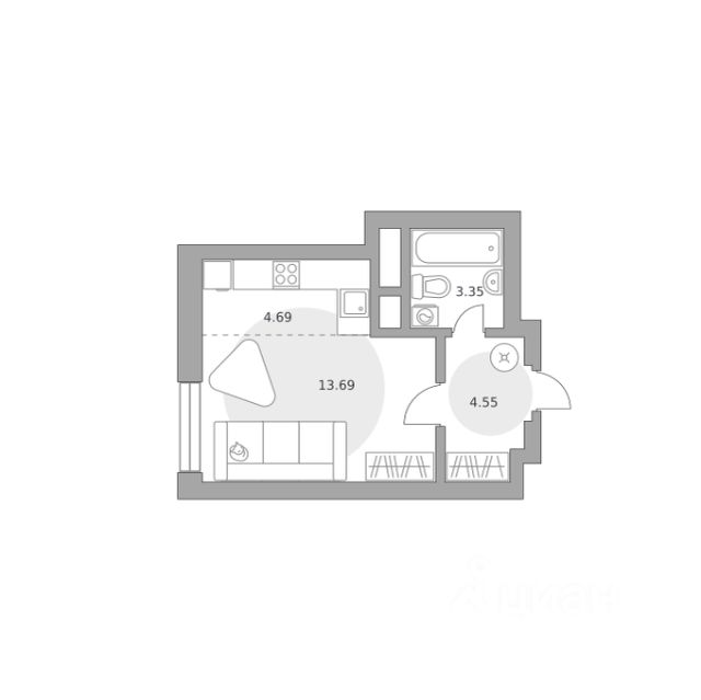 Продаётся студия 966, площадью 21,44 м², на 23 этаже в ЖК "Ильинойс" корпус 3. Стоимость — от 6116884 руб. Квартира без отделки, планировка односторонняя, окна на улицу.