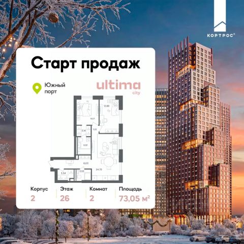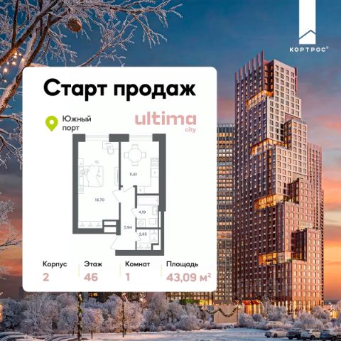 Указанная акционная стоимость доступна при 100% оплате или ипотеке без субсидирования. Цена действует до 16.02.2026 23:59:59. Стоимость без акции 24947760. Старт продаж! Продаётся 2-комнатная квартира от застройщика ГК "КОРТРОС" в жилом комплексе бизнес-класса ULTIMAcity. Квартира расположена на 2 этаже 52 этажного корпуса 2. Общая площадь 54,71 м². Без отделки. В квартире: • Мастер-спальня • Гардеробная • Ниша-кладовая на кухне • Два сан. узла ULTIMAcity — жилой комплекс бизнес-класса в перспективном районе на юго-востоке Москвы. На его территории появятся 9 башен на 756 этажей, двухуровневый подземный паркинг, собственная инфраструктура, включая детский сад и школу. Всего девелопер благоустроит территорию в 2,6 га. Ближайшая станция метро — "Южный порт". Она откроется в 2028 году и будет находиться в 2-х минутах ходьбы. А прямо напротив расположится остановка водного автобуса-электрохода "Синичка". Дорога от квартала будет удобна и для автомобилистов: - до Кремля — 12 км - до МКАД — 12 км - до выезда на ТТК — 3 км - до Садового кольца — 8 км В двух корпусах первой очереди ULTIMAcity этажностью 45 и 52 реализуется 1 079 квартир с продуманными, рациональными планировочными решениями. В ассортиментной линейке представлены однокомнатные квартиры от 28,2 до 61 кв. м, двухкомнатные лоты от 44,3 до 95,4 кв. м, квартиры с тремя (71 — 115,57 кв. м) и четырьмя спальнями (106,6 — 114,97 кв. м). В экспозиции также есть квартиры с террасами, лоджиями, тремя и четырьмя санузлами, а также с функциональными нишами-кладовыми на кухнях. Запроектированы и эксклюзивные двухуровневые резиденции со вторым светом, в том числе с видом на Москву-реку, площадью от 77,7 до 141,9 кв. м. В рамках проекта запланировано строительство 9 корпусов, школы на 500 учащихся и детского сада на 225 мест. Еще будет создана продуманная инфраструктура для жителей: детские и спортивные площадки, амфитеатр для мероприятий, беседки и теплицы для садоводства, коворкинг, детский клуб и ресторан с открытой террасой. Доступ в жилой комплекс осуществляется по биометрическому контролю - Face ID. Вокруг квартала будет приватная территория с видеонаблюдением и консьерж-сервисом 24/7. Лобби корпусов будут иметь двойные выходы: на улицу и во внутренний закрытый двор.