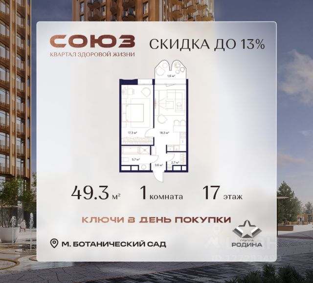 Рассрочка 0% Продаётся 4-комнатная квартира площадью 127.6 м² на 18 этаже в Жилом Комплексе "Союз". Квартал здоровой жизни премиум-класса с рекордным количеством олимпийских видов спорта: - Ледовая арена для хоккея и фигурного катания, - Футбольные поля для тренировок, - Спортивный зал для фехтования, - Бассейн на 6 дорожек, - Центр единоборств, - 4 крытых площадки для настольного тенниса, - 7 теннисных кортов (крытых и открытых), - 4 крытых площадки для сквоша, - Легкоатлетический стадион, - Площадки для баскетбола и волейбола. Уникальные форматы квартир с мастер-спальнями, приватными террасами, балконами, а также пентхаусы с открыточными видами на город. Все квартиры продаются с отделкой Shell&Core и панорамным остеклением. Расположение Пешком: - 2 мин. до парка "Сад Будущего"; - 6 мин. до ст. м. "Ботанический сад"; - 6 мин. до ст. МЦК "Ботанический сад"; - 6 мин. до парка "Леоновская роща"; На автомобиле: - 2 мин. до СВХ (МСД); - 5 мин. до Проспекта Мира; - 10 мин. до ТТК; - 15 мин. до Садового кольца; - 25 мин. до аэропорта "Шереметьево". Благоустройство - собственная спортивная инфраструктура 7 Га; - зона для пикников; - игровые и спортивные площадки для детей всех возрастов; - розарий, а также сосновые, каштановые и дубовые аллеи; - площадки под открытым небом для занятий спортом и йоги; - игровые комнаты для детей; - лаунж-зона для резидентов; - просторная переговорная для деловых встреч; - премиальный ресторан "Шабада" Сосо Павлиашвили с водными арт-объектами на прогулочной аллее, садом ароматных трав и сценой под открытым небом; - кафе, химчистки, аптеки и супермаркеты рядом с домом. Окружение - 8 парков: Сад Будущего, Леоновская роща, Хуамин, Главный ботанический сад РАН, Шереметьевская дубрава, Останкино, парк спорта "Яуза", пойма реки Яуза и музей-усадьба "Останкино"; - 3 ВУЗа: ВГИК, РГСУ, МГПУ; - 12 школ, в том числе: школа 1499 им. И.А. Докукина (топ 100), Brookes Moscow, IThub школа; - 18 детских садов, в том числе билингвальный ALERTUM KIDS; - один из крупнейших океанариумов Европы "Москвариум"; - один из крупнейших в Европе торгово-развлекательных центров "Европолис". Продам квартиру от застройщика рядом с метро Свиблово.