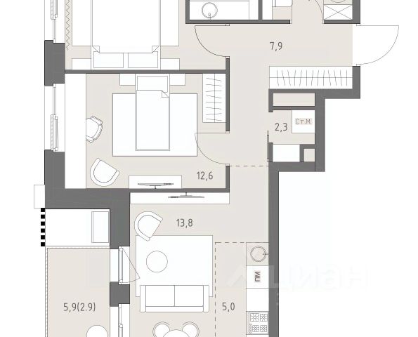 Прямая продажа от застройщика. В ЖК Сет продается 4-комнатная квартира площадью 102.56 м², расположенная в корпусе Б, на 48 этаже 59 этажного дома. Сет имеет стратегически выгодное расположение в ЗАО, в районе с большой историей и блестящим будущим: между природной зоной долины реки Сетунь и Кутузовским проспектом. В рамках возведения первой очереди предусмотрено три корпуса высотой 18, 45 и 59 этажей. На верхних этажах спроектированы общедоступные смотровые площадки с панорамным обзором на центр столицы. Преимущества проекта: • Функциональные планировочные решения • Контроль проникновения через входную дверь • Система управления освещением и температурой в квартире • Система защиты от протечек с функцией перекрытия воды • Вход в подъезд по биометрическим считывателям Face ID • Скоростные лифты • Двухуровневый подземный охраняемый паркинг на 495 машино-мест Застройка Сет включает в себя не только жилые корпуса, но и инфраструктурные объекты. Все необходимое для повседневного комфорта будет расположено в шаговой доступности: • Фитнес-Клуб с бассейном • Ведущая городская школа, детский сад и школа искусств • Центр культуры и досуга • Медицинский центр • Кафе и рестораны Расположение комплекса: Пешком: • Метро "Давыдково" - 17 минут • Парк "Долина реки Сетунь" - 3 минуты • Открытие новых станций метро в шаговой доступности в будущем Инфраструктура: Разнообразить свой день резиденты Веер смогут также проводя больше времени на свежем воздухе. Двор разделен на 4 зоны разных эмоций и действий, которые пересечены и соединены веерными прогулочными маршрутами: • Спортивная площадка устроена в глубине "Кленовой рощи" • В "Чайном домике" будет создан навес с утеплением для отдыха в любую погоду • Площадки для детей воплотятся в "Волшебный лес" с цветами, зеркалами и световым дизайном • "Центральная площадь" устроена у водного оазиса живописного пруда. На машине: • "Москва-Сити" - 15 минут • Садовое кольцо - 20 минут • ТЦ "Океания" - 8 минут • ТЦ "Времена года" - 13 минут • Сколково - 12 минут • Гребной канал - 17 минут Компания MR предлагает своим клиентам специальные условия приобретения квартир в рамках программ ипотечного кредитования от банков-партнеров. Купить квартиру от застройщика в районе Можайский в Москве.