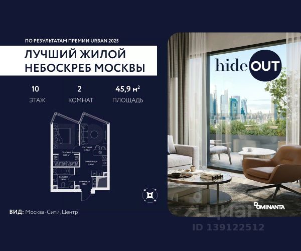 Прямая продажа от застройщика. Продается 2-комнатная квартира площадью 42.7 кв.м. на 8-м этаже 34-этажного дома в ЖК hideOUT с панорамными видами: Во двор. Высота потолков 3,25 м. hideOUT — премиальный проект компании Dominanta. Это новый уровень жизни и комфорта без компромиссов. Две башни — 34 и 49 этажей — открывают захватывающие виды на Москву. Архитектурной доминантой проекта становится мост, соединяющий башни на высоте 80 метров. Закрытая территория, охрана 24/7, зона экстренной безопасности на подземном уровне, система пожаротушения. На мосту между башнями на 22-м этаже находится SocialHUB — предусмотрено 16 комфортных пространств для работы, отдыха и развлечений с панорамными видами и клубным форматом доступа. Концепция благоустройства hideOUT — баланс между природой и технологичным городом будущего. На территории сада предусмотрены 15 зон для отдыха, работы, спорта и детей. Знаковым местом станет центральная площадь с амфитеатром и водопадом — сочетание камней, растений и струящейся воды создает идеальный баланс с природой. В проекте действуют привлекательные условия покупки: - скидка до 20% при 100% оплате стоимости лота и ипотеке без субсидирования. Предложение действует до 28.02.2026. - рассрочка 0% на 12 месяцев с первоначальным взносом 30% / на 18 месяцев с первоначальным взносом 50%. Застройщик АО "СЗ "ХАЙДАУТ", ИНН 7729058636, ОГРН 1027739319420. Проектная декларация на сайте наш.дом.рф. Предложение не является публичной офертой.