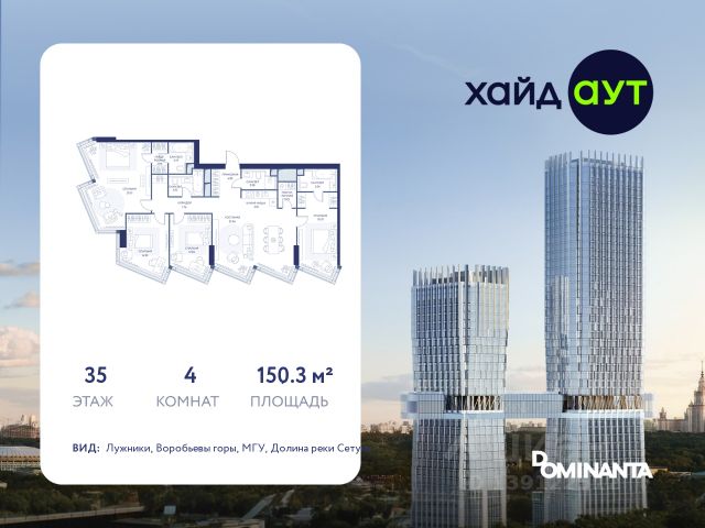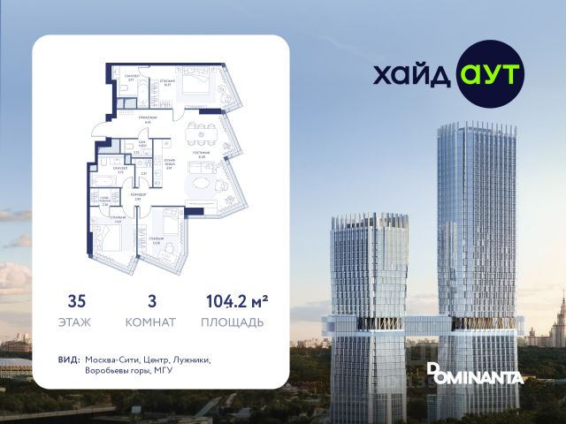 Прямая продажа от застройщика! Продается 3-комнатная квартира площадью 129 кв.м. на 33-м этаже 34-этажного дома в жилом комплексе ХАЙДАУТ с панорамными видами: Парк Победы, Долина реки Сетунь, МГУ, Москва-Сити, Воробьевы горы. Высота потолков 3,25 м. В ХАЙДАУТ доступны различные условия покупки — от специальных предложений при полной оплате до комфортных программ рассрочки и индивидуальных ипотечных решений. ХАЙДАУТ — премиальный проект компании Dominanta. Это новый уровень жизни и комфорта без компромиссов. Две башни — 34 и 49 этажей — открывают захватывающие виды на Москву. Архитектурной доминантой проекта становится мост, соединяющий башни на высоте 80 метров. Закрытая территория, охрана 24/7, зона экстренной безопасности на подземном уровне, система пожаротушения. На мосту между башнями на 22-м этаже находится общественное пространство SocialHUB — предусмотрено 16 комфортных пространств для работы, отдыха и развлечений с панорамными видами и клубным форматом доступа. Концепция благоустройства ХАЙДАУТ — баланс между природой и технологичным городом будущего. На территории сада предусмотрены 15 зон для отдыха, работы, спорта и детей. Знаковым местом станет центральная площадь с амфитеатром и водопадом — сочетание камней, растений и струящейся воды создает идеальный баланс с природой. Застройщик АО "СЗ "ХАЙДАУТ", ИНН 7729058636, ОГРН 1027739319420. Проектная декларация на сайте наш.дом.рф. Предложение не является публичной офертой.
