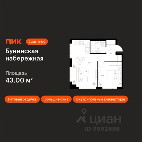 2-к 40,3 м в ЖК "Бунинские кварталы".