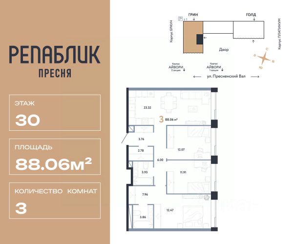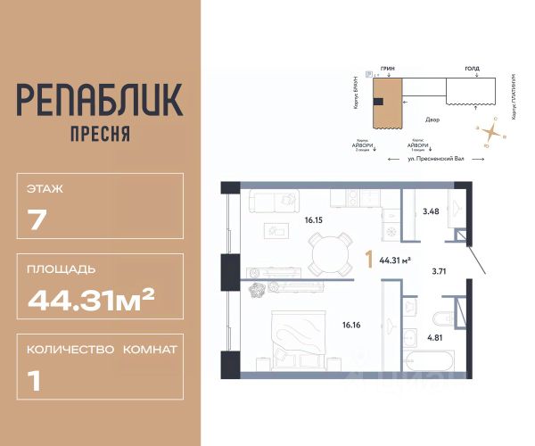 Рассрочка 0% с первым взносом от 20%, ипотека с субсидией или наличные. Подберём способ оплаты индивидуально. Продается 2комнатная квартира на 2 этаже от застройщика Страна Девелопмент. Площадь квартиры 45.24 кв. м. Дизайн-квартал "Republic" — новый проект премиум-класса в Москве от федерального застройщика "Страна Девелопмент". ЦАО, Пресня, 7 мин. от метро "Белорусская". 10 жилых башен и 4 восстановленных здания локомотивного депо образуют уникальное пространство. "Republic" — место, где вы ощутите гармонию истории и современности. За 12 мин. вы сможете дойти до Московского зоопарка, за 10 мин. на авто доехать до Патриарших прудов и Белого дома. Преимущества • Благоустройство. SPA-комплекс с бассейном и термами, гастрономический, учебный и шопинг-центры, приватный бульвар и яркие арт-пространства — для жителей предусмотрены все элементы премиального комфорта. • Панорама на центр. Наслаждайтесь видами ЦАО каждый день: панорама на историческую Пресню и башни Москва-Сити — из своей квартиры или с приватной террасы на крыше. • Концептуальное лобби в каждой башне. С общей террасой на кровле, с библиотекой, коворкингом и фитнес-рум. Стойка консьержа перетекающая в бар и др. • Современные форматы квартир. Свободные планировки, с террасой или балконом, с возможностью установки камина, от 1-комнатных до пентхаусов. • Отделка Квартиры сдаются без отделки или в формате White box. При White box уже выполнены все шумные и грязные работы: произведена разводка электричества с подрозетниками, установлены откосы из гипсокартона, устроена стяжка пола с шумоизоляцией и др. Способы покупки Сотрудники "Страна Девелопмент" будут сопровождать вас на каждом этапе сделки, помогут получить одобрение по ипотеке или снизить ежемесячный платеж. - ипотека (стандартная/с субсидией/траншевая) - рассрочка (с ПВ от 20%) - с использованием материнского капитала - оплата наличными Купить квартиру от застройщика на улице Пресненский Вал в Москве.