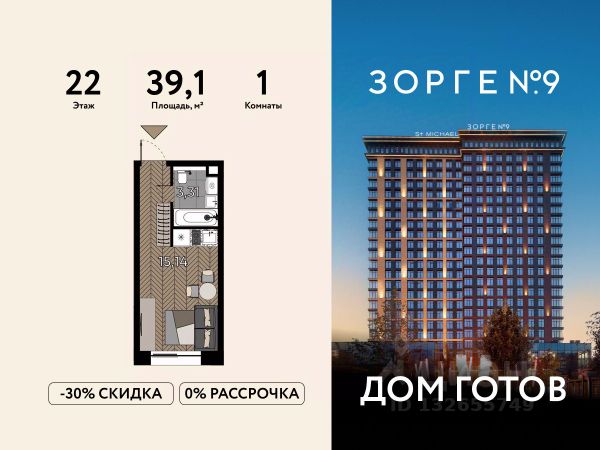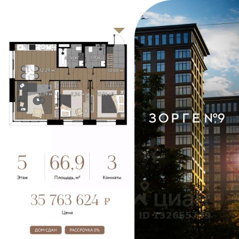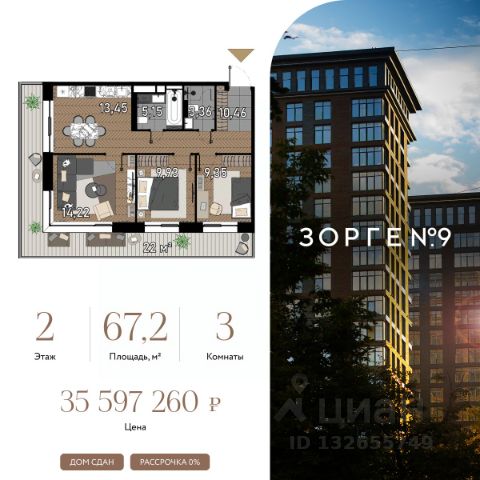 "Зорге 9" — готовые апартаменты бизнес-класса на Ходынке. 10 минут до Москва-Сити. Архитектура: 3 современных корпуса с фасадами в стиле архитектуры Нью-Йорка и с сервисами премиальных отелей, высотой до 23 этажа. Строгие линии, панорамные окна создают ощущение неподдельной роскоши и комфортной жизни в сердце мегаполиса. Проект награжден авторитетной премией European Property Awards. Резиденции: Свободная планировка, небольшая глубина этажа, огромные панорамные окна в пол до 3,6 м и высота потолков до от 3,3 до 4,3 м позволяют реализовать самые смелые концептуальные идеи и создать идеальный интерьер с учетом всех пожеланий. Вдохновляющие виды на город украсят ваш апартамент лучше любой картины. Есть возможность приобретения дизайн-проекта и полной меблировки апартаментов от партнеров девелопера. Расположение: 3 мин. пешком до парка Березовая роща 10 мин. пешком до Ходынского поля 10 мин. до ТЦ Авиапарк 30 минут до Шереметьево 10 мин до Москва-Сити или 1 станция до Москва-Сити 5 минут до ТТК 4 станции метро в шаговой доступности: 6 мин м. Полежаевская (фиолетовая ветка) 7 мин МЦК Зорге (МЦК) 7 мин м. Хорошевская (голубая ветка) 10 мин МЦК Хорошёво (МЦК) Благоустройство: Собственный парк 2 га с амфитеатром и поющими фонтанами. В парке высажено 136 деревьев и более 11 000 кустов и мелких растений из немецких питомников. Площадка для йоги и воркаут-зона со спортивными площадками. Теннисные столы и детский плейхаб Две башни Авторское гранд-лобби В лобби предусмотрена лаундж-зона, чайная с камином, комната для хранения велосипедов и колясок. Доступ по системе FACE ID. В отделке лобби и лифтовых холлов использован декоративный камень итальянского бренда Atlas Concorde Пентхаусы На верхнем уровне комплекса расположены роскошные просторные пентхаусы с высотой потолка до 4,2 метра и панорамными окнами до 3,6 метров, открывающими великолепные виды на столицу. Пентхаусы с выходами на собственные приватные террасы на кровле, площадью от 150 кв. м являются жильем high-уровня, демонстрирующим высокий статус владельца. Квартира от застройщика на улице Зорге в Москве.