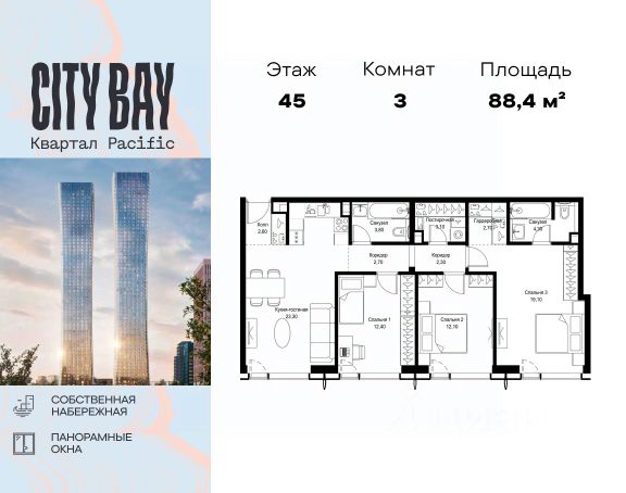 Прямая продажа от застройщика. Продаётся 4-комнатная квартира общей площадью 104.60 м² без отделки в ЖК City Вау, квартале Pacific, на 6-м этаже 59 этажного дома. Концепция жилого комплекса City Вау - настоящий город в городе с отлично развитой инфраструктурой и собственной благоустроенной набережной. На территории жилого комплекса расположено пять кварталов - Atlantic, Pacific, Indian, North, Cliff. Жилой квартал City Вау отличается оригинальной концепцией и выделяется среди других проектов такими характеристиками как: - Архитектура, - Виды из окон, - Природное окружение, вызывая гордость у жителей и восхищение у прохожих. Вся жизнь района Покровское-Стрешнево строится вокруг водных объектов: - Пойма реки Сходни с уникальной экосистемой, - Речка Химка и Химкинское водохранилище, - Москва-река, - Канал имени Москвы. Кругом вода, и местные с удовольствием этим пользуются. А сразу за рекой - центр водного спорта в Строгино с вейк-парком и яхт-клубами. Помимо воды, здесь очень много зелени: - Рядом Сходненский ковш памятник природы, естественный амфитеатр глубиной 40 метров; - Парк при усадьбе Братцево с фруктовым садом; - Дубовая роща "Маяк", - Алешкинский лес; - Лесопарк Покровское-Стрешнево с пляжами и бобрами. Главные транспортные артерии района: - Волоколамское шоссе, - Таганско-Краснопресненская линия метро и МЦД-2. Всего за 20 минут можно добраться до центра на машине или метро, а МЦД связывает ЖК City Вау с северными, восточными и юго-восточными районами. Компания MR предлагает своим клиентам специальные условия приобретения квартир в рамках программ ипотечного кредитования от банков-партнеров. Купить квартиру от застройщика на шоссе Волоколамское в Москве.