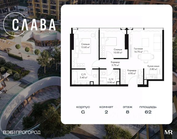Квартиры премиум-класса в жилом комплексе Слава у м. "Белорусская" от застройщика. В продаже 2-комнатная квартира площадью 62 м² на 8-м этаже корпуса G. Новый современный жилой комплекс премиум-класса Слава расположен в той части центра, где традиция соединяется с прогрессивными городскими тенденциями. Здесь историческая Москва встречается с передовым миром. Популярные театры и старинные церкви соседствуют с современным деловым кварталом и гастрономическим кластером Депо. Слава находится всего в 5 мин. пешком от м. "Белорусская", по-новому открывая Ленинградский проспект. Проект был разработан легендарным архитектором Хельмутом Яном, основателем чикагского архитектурного бюро Jahn. Его работы отмечены множеством наград и реализованы в мегаполисах по всему миру. По замыслу архитекторов, жилой комплекс образуют четыре высотные башни, соединенные одноэтажным стилобатом "Хронограф". Здесь, на первом уровне, открытые и закрытые общественные пространства: небольшие сады, места для встреч и отдыха, кафе, рестораны, магазины, спортивный центр и даже выставочное пространство. Важнейшей особенностью пространства является его всесезонность: благодаря правильной организации, ландшафтному дизайну, инженерной инфраструктуре здесь будет уютно и в жару, и в xолод, и в ненастье. На втором уровне стилобата расположится приватный парк для жильцов. Особенности комплекса: - Идеальное расположение в престижной части Москвы (10 мин. от Кремля) - Панорамное остекление - Подземный паркинг с дизайнерской отделкой - Современные инженерные системы - Продуманная внутренняя инфраструктура - Приватный сад 7700 кв.м. Расположение комплекса: - 5 минут до станции метро "Белорусская" - 3 минуты до ТТК - 8 минут до "Садового кольца" Компания MR предлагает своим клиентам специальные условия приобретения квартир в рамках программ ипотечного кредитования от банков-партнеров.
