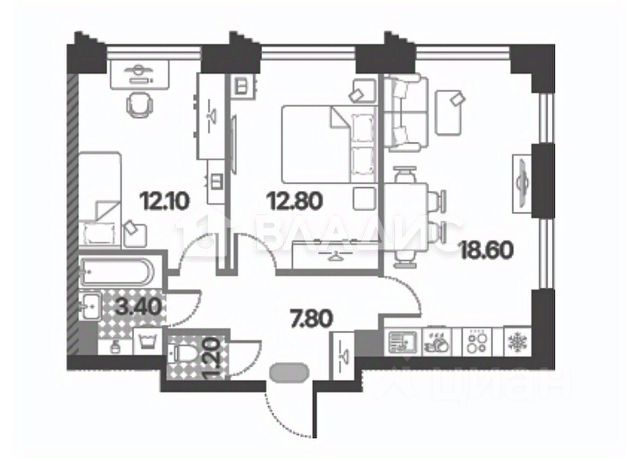 Функциональная планировка: большая кухня-гостиная ( 19.6 кв.м.), при желании можно сделать изолированную комнату (14.8 кв.м.), просторная спальня (12 кв.м.), вместительные прихожая ( 4.8 кв.м) и санузел (4.1 кв. м.), высокие потолки и видовой этаж.