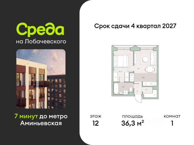 О квартире Продаётся двухкомнатная квартира общей площадью 54.60 кв. м. с отделкой на выбор: черновая, White Box. Квартира на 26 этаже корпуса 5.5 в жилом комплексе бизнес-класса "Среда на Лобачевского". До метро "Аминьевская" 7 минут пешком. Развитый район с удобным выездом "Среда на Лобачевского" строится рядом с Аминьевским и Очаковским шоссе, отсюда можно доехать до МКАД или Ленинского проспекта за 10 минут. В районе уже есть всё для жизни: рестораны, кофейни, торговые центры, поликлиники и спортивные комплексы, школы и сады, бульвары и парки. - 7 минут ходьбы до станции метро "Аминьевская". - 15 минут пешком до станции МЦД-4 "Очаково". - 8-15 минут на машине до Кутузовского проспекта и ТТК. - До 15 минут езды до заказников "Долина реки Сетунь" и "Воробьёвы горы". Акции и спецпредложения - Выгода 12%: если внести 100% оплату или оформить семейную ипотеку под 6%. Действует до 13 апреля. - Низкие ставки по ипотеке: 0,1% в первый год или 0,11% в первые два года кредита. - Трейд-ин от "Среды": можно обменять свою текущую квартиру на новую. - Ипотека для семей с детьми: если ребёнку до 7 лет, предлагаем льготную ставку 3,5% О жилом комплексе "Среда на Лобачевского" - новый квартал в парадном стиле старой Москвы. Благодаря разноэтажной застройке во дворе комплекса будет много света и воздуха, без ощущения замкнутого пространства. Во дворе лаунж-зоны для медитации и работы, площадки для игр и кинопоказов, а на первых этажах - кофейни и магазины. Особенности - Высота потолков 3,24 метра. - Панорамное остекление в пол. - Квартиры с террасами, мастер-спальнями и сквозными планировками. - Дизайнерские гранд-лобби в каждом корпусе. - Ландшафтный парк с зонами отдыха у воды. - Коворкинг на свежем воздухе. - Локации для спорта, игр и приватного отдыха. - Соседский бульвар с площадкой для подростков. - Подземный паркинг с двумя въездами. - Система бесключевого доступа. - Стрит-ритейл на первых этажах.