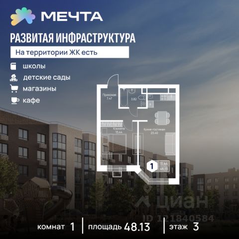 Рассрочка 0% от застройщика! Продается однокомнатная квартира в квартале "Дружба" жилого комплекса "Мечта". Общая площадь квартиры: 46.71 кв. м, этаж 1 из 5. Заселение: 2 квартал 2026 г. Отделка: Получистовая ОСОБЕННОСТИ: - Просторная кухня-гостиная - Продуманная планировка - Застекленная лоджия - Широкоформатные окна - Высота потолка: 2.7 метра Жилой комплекс "Мечта" расположен в 23 км от МКАД по Дмитровскому или Ленинградскому шоссе. ТРАНСПОРТНАЯ ДОСТУПНОСТЬ: - 15-20 минут на общественном транспорте до МЦД-1 "Лобня" - 30-35 минут на общественном транспорте до метро "Физтех" - 45-50 минут до станций метро "Савеловская" или "Белорусская" - 30 минут на автомобиле до Москвы Квартал "Дружба" состоит из пяти пятиэтажных домов с несколькими подъездами. Каждый дом оборудован широкими окнами, которые обеспечивают максимальный доступ естественного света и открывают прекрасный вид на окружающую природу. Квартал отличается большими застеклёнными лоджиями, которые позволяют наслаждаться свежим воздухом и красивым видом, не покидая своего жилища. Инфраструктура включает в себя муниципальную школу и детские сады, кабинет врача общей практики, множество кафе и ресторанов, а также различные спортивные и детские площадки. В пешей доступности от жилого комплекса расположены лес и три реликтовых озера — Долгое, Круглое и Нерское, а также реки Альба, Уча и Волгуша. Территория жилого комплекса закрыта для посторонних, находится под охраной и патрулируется. На въезде расположен КПП. Камеры видеонаблюдения работают круглосуточно на всей территории. Вы и ваши дети будете чувствовать себя в безопасности.