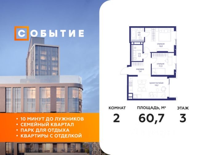 В продаже 1-к квартира от застройщика. Общая площадь 39.00, жилая 14.50, кухня 16.6. Квартира расположена на 9 этаже жилого квартала "Событие-6", корпус 1, Секция Секция 3. Квартира с чистовой отделкой. Срок сдачи: 4 кв. 2029 года. СОБЫТИЕ.6 — финальный дом парк-квартала СОБЫТИЕ на Мосфильмовской. Переезжайте в уже сформированный квартал с готовой инфраструктурой и парком! Премиальный жилой комплекс в престижном районе Москвы предлагает стильную архитектуру, продуманное благоустройство и великолепно разнообразие общественных пространств. Свой парк прямо возле дома! Архитектура Архитектура СОБЫТИЯ.6 выполнена в ультрасовременном стиле московским бюро Atrium на основе дизайн-кода британских архитекторов LDA Design и UHA London. Дом отличает оригинальная геометрия фасадов, большое остекление и высокие лобби (до 6,2 м) с авторской мебелью и светильниками. Расположение Мосфильмовская улица (Раменки) — один из престижных районов Москвы. Близость к историческому и деловому центру, природным зонам Запада столицы. Транспортная доступность: • 10 мин до Москва-Сити и ТТК; • 15 мин до Садового кольца; • 25 мин до аэропорта Внуково; • 7-10 мин до станций метро "Аминьевская" и "Мичуринский проспект". Инфраструктура: • парк "Событие" (12 га, финалист конкурса Правительства Москвы) с беговыми (1,5 км) и велодорожками (2,7 км), экотропой (1,6 км), площадками, лекторием; • школа, детский сад, магазины, салоны красоты, рестораны (к моменту заселения); • мультидвор с игровыми и спортивными площадками, мини-бульваром; • общественная терраса на 10-м этаже (коворкинг, лаунж); • Закрытые общественные пространства: детская комната, спортивный зал, коворкинг, лаунж-зоны. Паркинг 256 мест для жителей (48 — для электромобилей), 24 гостевых (5 — для электромобилей), мойки колес, кладовые, зоны для велосипедов. Окружение Парки и заповедники (Воробьёвы горы, Матвеевский лес и др.), МГУ, театр им. Н. И. Сац, стадион "Лужники". Безопасность Видеонаблюдение, контроль доступа, видеодомофоны, консьерж-сервис 24/7, системы пожарной безопасности и мультисервисная оптическая сеть.