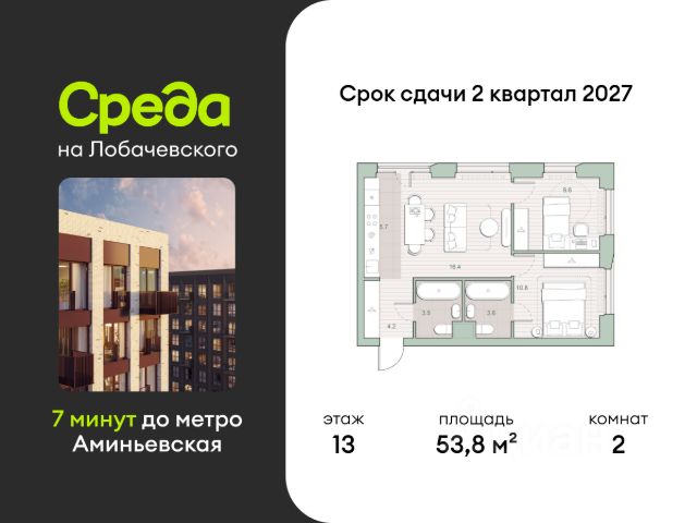 О квартире Продаётся двухкомнатная квартира общей площадью 54.60 кв. м. с отделкой на выбор: черновая, White Box. Квартира на 26 этаже корпуса 5.5 в жилом комплексе бизнес-класса "Среда на Лобачевского". До метро "Аминьевская" 7 минут пешком. Развитый район с удобным выездом "Среда на Лобачевского" строится рядом с Аминьевским и Очаковским шоссе, отсюда можно доехать до МКАД или Ленинского проспекта за 10 минут. В районе уже есть всё для жизни: рестораны, кофейни, торговые центры, поликлиники и спортивные комплексы, школы и сады, бульвары и парки. - 7 минут ходьбы до станции метро "Аминьевская". - 15 минут пешком до станции МЦД-4 "Очаково". - 8-15 минут на машине до Кутузовского проспекта и ТТК. - До 15 минут езды до заказников "Долина реки Сетунь" и "Воробьёвы горы". Акции и спецпредложения - Выгода 12%: если внести 100% оплату или оформить семейную ипотеку под 6%. Действует до 13 апреля. - Низкие ставки по ипотеке: 0,1% в первый год или 0,11% в первые два года кредита. - Трейд-ин от "Среды": можно обменять свою текущую квартиру на новую. - Ипотека для семей с детьми: если ребёнку до 7 лет, предлагаем льготную ставку 3,5% О жилом комплексе "Среда на Лобачевского" - новый квартал в парадном стиле старой Москвы. Благодаря разноэтажной застройке во дворе комплекса будет много света и воздуха, без ощущения замкнутого пространства. Во дворе лаунж-зоны для медитации и работы, площадки для игр и кинопоказов, а на первых этажах - кофейни и магазины. Особенности - Высота потолков 3,24 метра. - Панорамное остекление в пол. - Квартиры с террасами, мастер-спальнями и сквозными планировками. - Дизайнерские гранд-лобби в каждом корпусе. - Ландшафтный парк с зонами отдыха у воды. - Коворкинг на свежем воздухе. - Локации для спорта, игр и приватного отдыха. - Соседский бульвар с площадкой для подростков. - Подземный паркинг с двумя въездами. - Система бесключевого доступа. - Стрит-ритейл на первых этажах.