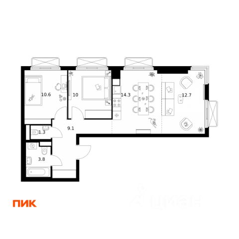 Светлая, теплая, имеет 2 полноценные комнаты (10 и 14,2 кв.м.), кухню-гостиную (14.1 кв.м.), 2 санузла с ванной и душевой.