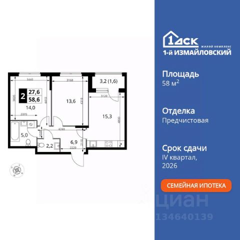 Прямая продажа от застройщика! Жилой Комплекс Комфорт класса. Продаётся 2-к квартира номер 292 общей площадью 58.6 кв.м. на 2-м этаже 12 этажного здания. Предчистовая отделка. Цена с учётом скидки. Особенности квартиры: - Организуем показ в удобное для вас время! - Линейная планировка - максимальная функциональность и удобство. - Гостевой санузел - комфорт и удобство для ваших гостей. - Гибкая планировка - создайте пространство по своему вкусу. - Можно оборудовать рабочее место - комфорт для работы и учёбы. - Просторная кухня - место для семейных ужинов и кулинарных экспериментов. - Линейная кухня - функциональность и практичность в одном решении. - Наличие острова на кухне - удобство и стиль для вашей кухни. - Возможность добавить спальное место - дополнительный комфорт для гостей. - Лоджия - уютное место для отдыха и тишины. Квартира с предчистовой отделкой. Вам не придется заниматься черновыми и трудоёмкими работы, а чистовую отделку и дизайн - сделайте на свой вкус. Информация о комплексе: ЖК "1-й Измайловский" в восточной части Москвы: идеальное место для жизни в окружении 14 000 гектаров леса. Наслаждайтесь лыжными прогулками зимой и пробежками летом в сиреневом саду и лесопарках. Комплекс отгорожен от шоссе застройкой первой линии и садами здоровья. Из окон открываются виды на парк "Лосиный остров" и зеленые дворы. Близость к природе и спортивным объектам создаёт атмосферу здорового образа жизни. Транспортная доступность: Не более 2,5 км до станций метро "Щёлковская" и "Черкизовская" и МЦК "Локомотив". Щёлковское шоссе соединяет квартал с Северо-восточной хордой и МКАД, Центральным автовокзалом и Восточным железнодорожным вокзалом. Две автобусные остановки в паре минут ходьбы и 11 маршрутов общественного транспорта. На автомобиле 3 минуты до СВХ 12 минут до ТТК 15 минут до Садового кольца Внутренняя инфраструктура: ЖК расположен в историческом районе Москвы с развитой инфраструктурой. В шаговой доступности: 6 детских садов (включая собственный на 125 мест), 3 школы, поликлиники, торговые центры и парки. Проект создан для здорового образа жизни: рядом стадионы, спортивные объекты для футбола, баскетбола и конного спорта, а также более 30 км беговых и велодорожек. Всё для активной жизни в окружении зелени и современной инфраструктуры. Квартира с предчистовой отделкой - ваш дизайн без черновых работ