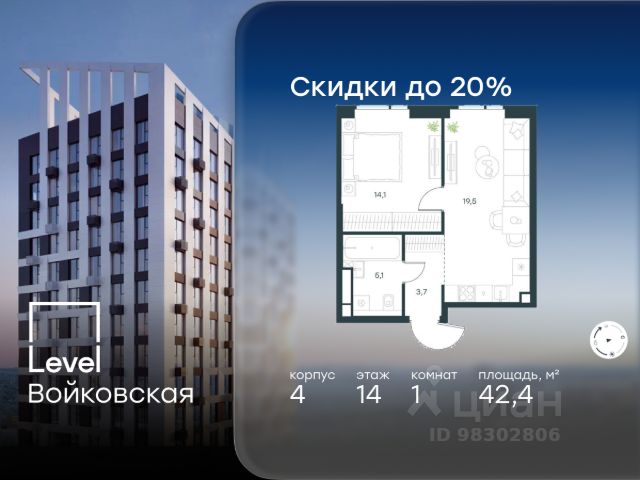 Цена указана с учётом скидки при 100%-й оплате, несубсидированной ипотеке, рассрочке (кроме программы "Рассрочка 0%"). Продается 2-комнатная квартира площадью 69.70 кв. м с отделкой. Квартира находится на 20 этаже 26-этажного корпуса 4, в новом жилом комплексе бизнес-класса Level Войковская, расположенном рядом с живописным заповедником "Покровское-Стрешнево" (застройщик - компания Level Group/Левел групп). Прекрасная транспортная доступность - 7 мин. пешком до станции МЦК "Балтийская"; - 15 мин. пешком до станции метро "Войковская"; - 8 мин. на машине до ТТК; - 15 мин. на машине до центра Москвы; - 20 мин. на машине до Москва-Сити. Продуманный архитектурный проект - стильная архитектура от мастерской Фефелова В. В.; - панорамные виды на парки, Химкинское водохранилище и Останкинскую башню; - лобби с высотой потолков до 6,45 метров; - более 20 видов планировочных решений, включая редкие форматы квартир с террасой и увеличенной высотой потолков до 5,42 метров; - 2 варианта дизайнерской отделки в корпусе 4, предлагаются как дополнительная опция к отделке white box: стиль Modern в светлых холодных тонах и стиль Classic в нейтральной бежевой гамме. Квартиры в корпусах 3 и 5 сдаются без отделки. Расположение Level Войковская строится в престижном Северном округе Москвы. Развитая инфраструктура и живописная природа переплетаются в единый ансамбль, столь значимый для комфортной жизни. Войковский район окружают парки и набережные. В шаговой доступности - парк "Покровское-Стрешнево", не более 15-ти минут на велосипеде занимает путь до Тимирязевского парка и 9-ти минут до парка усадьбы Михалково. Рядом более 60 школ, 75 дошкольных учреждений, 17 государственных и 6 частных вузов, 25 супермаркетов, 4 торговых центра, среди которых ТЦ "Метрополис" и ТЦ "Авиапарк". Внутренняя инфраструктура На территории жилого комплекса предусмотрены коммерческие помещения: кафе, ресторан, пекарня и другие сервисы откроются на первых этажах корпусов. Для жителей будет доступен отапливаемый подземный паркинг на 244 машино-места с доступом с любого этажа на лифте. На территории паркинга будет расположено 125 кладовых помещений для хранения сезонного инвентаря. Лобби и благоустройство Дизайн лобби Level Войковская создан совместно с бюро BLANK. Это уютные гостиные, где хочется задержаться. Теплая цветовая гамма, ресепшен, зоны ожидания, лапомойки и гостевые санузлы - каждая деталь превращает лобби в комфортное продолжение вашего дома. 1,15 га площади в первых двух этапах строительства отведено под приватный внутренний двор, который спроектирован совместно с бюро "Правда". Детские площадки для всех возрастов, спортивные пространства для йоги, воркаута и петанка, уютные зоны для тихого отдыха или работы. Здесь утро начинается с вдохновения, а вечер наполнен приятными моментами. Лифты Комфортное перемещение внутри жилого комплекса будут обеспечивать надёжные лифты с доступом в паркинг с жилых этажей. В каждом корпусе предусмотрено по 3 грузопассажирских лифта. Продается квартира с отделкой в районе Войковский в Москве.