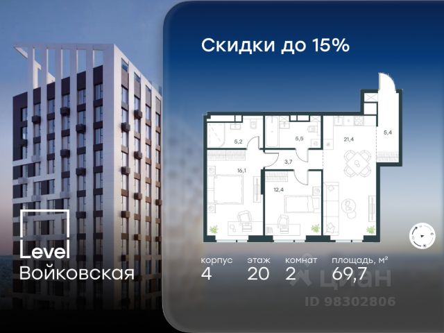 Цена указана с учётом скидки при 100%-й оплате, несубсидированной ипотеке, рассрочке (кроме программы "Рассрочка 0%"). Продается 2-комнатная квартира площадью 62.10 кв. м с отделкой. Квартира находится на 4 этаже 26-этажного корпуса 4, в новом жилом комплексе бизнес-класса Level Войковская, расположенном рядом с живописным заповедником "Покровское-Стрешнево" (застройщик - компания Level Group/Левел групп). Прекрасная транспортная доступность - 7 мин. пешком до станции МЦК "Балтийская"; - 15 мин. пешком до станции метро "Войковская"; - 8 мин. на машине до ТТК; - 15 мин. на машине до центра Москвы; - 20 мин. на машине до Москва-Сити. Продуманный архитектурный проект - стильная архитектура от мастерской Фефелова В. В.; - панорамные виды на парки, Химкинское водохранилище и Останкинскую башню; - лобби с высотой потолков до 6,45 метров; - более 20 видов планировочных решений, включая редкие форматы квартир с террасой и увеличенной высотой потолков до 5,42 метров; - 2 варианта дизайнерской отделки в корпусе 4, предлагаются как дополнительная опция к отделке white box: стиль Modern в светлых холодных тонах и стиль Classic в нейтральной бежевой гамме. Квартиры в корпусах 3 и 5 сдаются без отделки. Расположение Level Войковская строится в престижном Северном округе Москвы. Развитая инфраструктура и живописная природа переплетаются в единый ансамбль, столь значимый для комфортной жизни. Войковский район окружают парки и набережные. В шаговой доступности - парк "Покровское-Стрешнево", не более 15-ти минут на велосипеде занимает путь до Тимирязевского парка и 9-ти минут до парка усадьбы Михалково. Рядом более 60 школ, 75 дошкольных учреждений, 17 государственных и 6 частных вузов, 25 супермаркетов, 4 торговых центра, среди которых ТЦ "Метрополис" и ТЦ "Авиапарк". Внутренняя инфраструктура На территории жилого комплекса предусмотрены коммерческие помещения: кафе, ресторан, пекарня и другие сервисы откроются на первых этажах корпусов. Для жителей будет доступен отапливаемый подземный паркинг на 244 машино-места с доступом с любого этажа на лифте. На территории паркинга будет расположено 125 кладовых помещений для хранения сезонного инвентаря. Лобби и благоустройство Дизайн лобби Level Войковская создан совместно с бюро BLANK. Это уютные гостиные, где хочется задержаться. Теплая цветовая гамма, ресепшен, зоны ожидания, лапомойки и гостевые санузлы - каждая деталь превращает лобби в комфортное продолжение вашего дома. 1,15 га площади в первых двух этапах строительства отведено под приватный внутренний двор, который спроектирован совместно с бюро "Правда". Детские площадки для всех возрастов, спортивные пространства для йоги, воркаута и петанка, уютные зоны для тихого отдыха или работы. Здесь утро начинается с вдохновения, а вечер наполнен приятными моментами. Лифты Комфортное перемещение внутри жилого комплекса будут обеспечивать надёжные лифты с доступом в паркинг с жилых этажей. В каждом корпусе предусмотрено по 3 грузопассажирских лифта. Продается квартира с отделкой в районе Войковский в Москве.