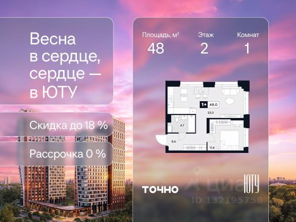 Скидка до 18% в апреле на выделенный пул лотов! ЮТУ — камерный проект бизнес-класса с исключительной архитектурой, видовыми квартирами и подходом к большой благоустроенной набережной канала имени Москвы. Проект создает идеальный баланс жизни в городе. Это приватный оазис, где в любой момент можно сменить обстановку и выбрать любой из тысячи маршрутов к активному отдыху и ярким впечатлениям. Удачное месторасположение: • Первая линия в прибрежной части Химкинского водохранилища • Исключительно тихий и зелёный район Южное Тушино • За 2 минуты можно спуститься к воде, за 10 минут найти зеленые парки и готовую инфраструктуру, за 30 минут доехать до Кремля Концепция проекта: • Две футуристичные башни, соединенные торговой галереей от бюро ATRIUM • 60 неповторяющихся планировок: квартиры с угловым панорамным остеклением, мастер-спальнями и гостиными до 39м², а также просторные квартиры площадью до 128,6 м² Чувство эксклюзивности: • Своя приватная жилая экосистема только для резидентов домов • Лаунж-терраса на крыше • В проекте предусмотрен закрытый двор-парк. Прогрессивные технологии: • 3-х уровневая система безопасности (Face ID, BLE-метки, видеонаблюдение) • Умный паркинг с распознаванием номеров Проект федерального девелопера ТОЧНО, который входит в ТОП-5 девелоперов России по объемам строительства. Купить квартиру с отделкой в районе Южное Тушино в Москве.