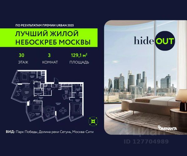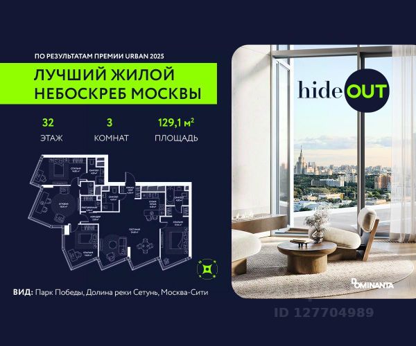 Прямая продажа от застройщика. Продается 3-комнатная квартира площадью 94,3 кв.м. на 25-м этаже 34-этажного дома в ЖК hideOUT с панорамными видами: Москва-Сити, Центр. Высота потолков 3,25 м. hideOUT — премиальный проект компании Dominanta. Это новый уровень жизни и комфорта без компромиссов. Две башни — 34 и 49 этажей — открывают захватывающие виды на Москву. Архитектурной доминантой проекта становится мост, соединяющий башни на высоте 80 метров. Закрытая территория, охрана 24/7, зона экстренной безопасности на подземном уровне, система пожаротушения. На мосту между башнями на 22-м этаже находится SocialHUB — предусмотрено 16 комфортных пространств для работы, отдыха и развлечений с панорамными видами и клубным форматом доступа. Концепция благоустройства hideOUT — баланс между природой и технологичным городом будущего. На территории сада предусмотрены 15 зон для отдыха, работы, спорта и детей. Знаковым местом станет центральная площадь с амфитеатром и водопадом — сочетание камней, растений и струящейся воды создает идеальный баланс с природой. В проекте действуют привлекательные условия покупки: - рассрочка 0% на 3 года с первоначальным взносом от 20%. Период рассрочки до 36 месяцев. - скидка до 20% при 100% оплате стоимости лота и ипотеке без субсидирования. Предложение действует до 31.12.2025.
