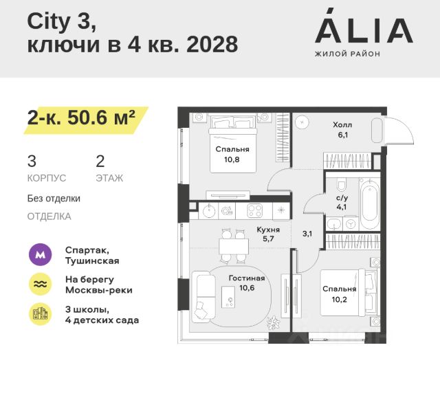 Продаётся 2-комнатная квартира 72.8 м². В жилом районе Алиа на 19-м этаже 28-этажного дома. Жилой район Алиа — это дома бизнес-класса у слияния Москвы-реки и Сходни. Алиа находится в Покровском-Стрешневе, экологически чистом районе на престижном северо-западе столицы. Район возводится на бывшей территории Тушинского аэрополя, где никогда не было промышленного производства. Алиа — это район разностороннего развития, спроектированный по принципу WORK.LIVE.PLAY.LEARN. Это "15-минутный город", где вся необходимая для комфортной жизни инфраструктура — на расстоянии приятной прогулки. У района удобное расположение: отсюда меньше 10 минут пешком до станций метро "Спартак" и "Тушинская" и всего полчаса на автомобиле до центра города или аэропорта Шереметьево. Архитектурную концепцию Алиа разработало бюро SOM (Skidmore, Owings & Merrill), авторы знаменитой "Бурдж-Халифа". В Алиа больше 140 планировочных решений, среди которых — редкие для Москвы форматы: квартиры с окном в ванной, пентхаус, сити-юниты и таунхаусы. Почти половина территории района отдана под благоустройство. В Алиа три парка: Линейный парк с кафе и магазинами, Центральный парк с амфитеатром, сухим фонтаном и большим плейхабом для детей всех возрастов и Прибрежный парк на собственной набережной, одной из самых длинных в Москве. В каждом урбан-блоке — закрытый внутренний двор с гипоаллергенными растениями и детской площадкой. В лобби каждого жилого корпуса в Алиа оборудована зона ожидания, колясочная, гостевой санузел и лапомойка для домашних животных. За стойкой ресепшена резидентов и их гостей встречает консьерж. Центральное лобби урбан-блока — это стильное общественное пространство с коворкингом, лаундж-зоной и кофе-пойнтом. Это "вторая гостиная" жителей урбан-блока и одно из мест, где формируется комьюнити Алиа. Два ключевых объекта инфраструктуры в Алиа — это спорткомплекс "Чкалов Арена", где представлены 25 видов спорта, и самый большой в стране бизнес-парк класса A, благодаря которому району обеспечено быстрое развитие.
