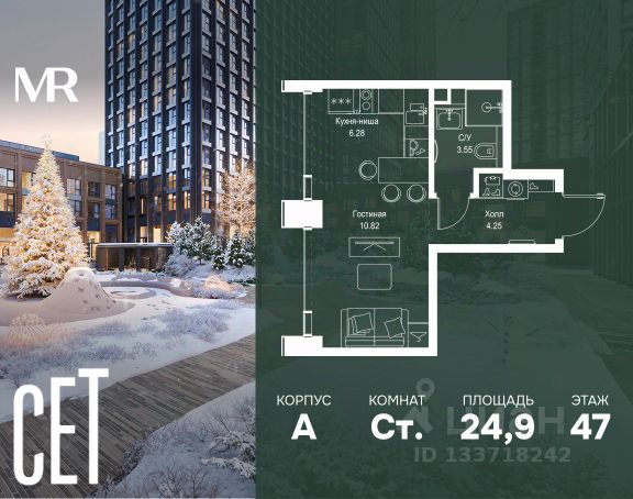 Прямая продажа от застройщика. В ЖК Сет продается студия площадью 27.51 м², расположенная в корпусе А, на 42 этаже 52 этажного дома. Сет имеет стратегически выгодное расположение в ЗАО, в районе с большой историей и блестящим будущим: между природной зоной долины реки Сетунь и Кутузовским проспектом. В рамках возведения первой очереди предусмотрено три корпуса высотой 18, 45 и 59 этажей. На верхних этажах спроектированы общедоступные смотровые площадки с панорамным обзором на центр столицы. Преимущества проекта: • Функциональные планировочные решения • Контроль проникновения через входную дверь • Система управления освещением и температурой в квартире • Система защиты от протечек с функцией перекрытия воды • Вход в подъезд по биометрическим считывателям Face ID • Скоростные лифты • Двухуровневый подземный охраняемый паркинг на 495 машино-мест Застройка Сет включает в себя не только жилые корпуса, но и инфраструктурные объекты. Все необходимое для повседневного комфорта будет расположено в шаговой доступности: • Фитнес-клуб с бассейном • Ведущая городская школа, детский сад и школа искусств • Центр культуры и досуга • Медицинский центр • Кафе и рестораны Расположение комплекса: Пешком: • Метро "Давыдково" - 17 минут • Парк "Долина реки Сетунь" - 3 минуты • Открытие новых станций метро в шаговой доступности в будущем Инфраструктура: Разнообразить свой день резиденты Веер смогут также проводя больше времени на свежем воздухе. Двор разделен на 4 зоны разных эмоций и действий, которые пересечены и соединены веерными прогулочными маршрутами: • Спортивная площадка устроена в глубине ""Кленовой рощи"" • В ""Чайном домике"" будет создан навес с утеплением для отдыха в любую погоду • Площадки для детей воплотятся в ""Волшебный лес"" с цветами, зеркалами и световым дизайном • ""Центральная площадь"" устроена у водного оазиса живописного пруда. На машине: • "Москва-Сити" - 15 минут • Садовое кольцо - 20 минут • ТЦ "Океания" - 8 минут • ТЦ "Времена года" - 13 минут • Сколково - 12 минут • Гребной канал - 17 минут Компания MR предлагает своим клиентам специальные условия приобретения квартир в рамках программ ипотечного кредитования от банков-партнеров. Купить 3-комнатную квартиру с парковкой в районе Можайский в Москве.