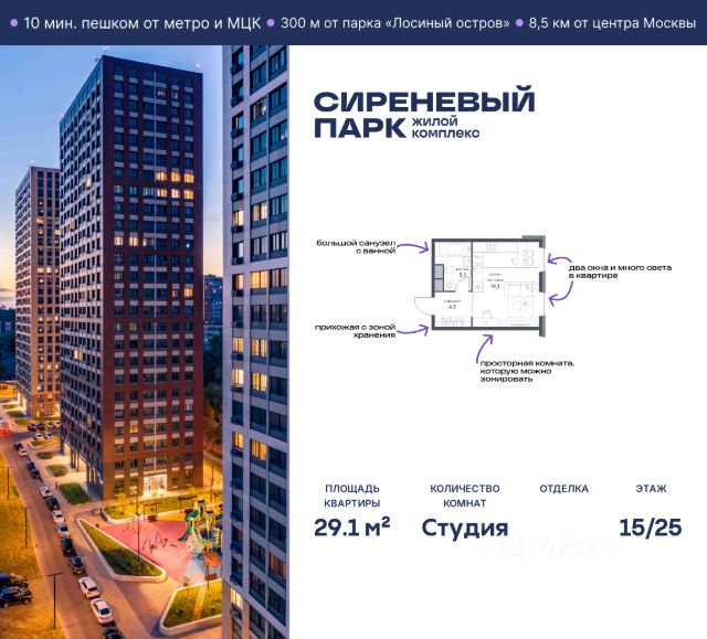 Продаётся просторная студия общей площадью 30.8 м² на 6 этаже в новом жилом комплексе "Сиреневый парк", расположенном в Восточном административном округе Москвы на улице Тагильская. Всего 10 минут ходьбы от станции метро "Бульвар Рокоссовского" и одноимённой платформы МЦК. Высококачественное монолитное строительство гарантирует сохранение тепла в доме, а наличие квартир с предчистовой и чистовой отделкой позволяет вам сэкономить время и сразу же переехать в свое жилье после покупки. Благодаря разнообразию планировок вы сможете выбрать идеальный вариант, соответствующий вашим предпочтениям и образу жизни. Предлагаются квартиры: - с просторными кухнями-гостиными, - с нишами для хранения вещей и отдельными гардеробными, - мастер-спальни с собственными санузлами, - большие комнаты с высокими потолками (2,9 м) и с увеличенными безопасными окнами (1,95 м) , которые наполнят ваш дом естественным светом; - с чистовой отделкой по двум дизайн-проектам на выбор; - с остекленными лоджиями и панорамными видами на лес. Каждая деталь в этом доме создана для вашего комфорта: - безбарьерная среда, - бесшумные скоростные лифты, - машиноместа в отапливаемом подземном паркинге и кладовые на -1 этаже с доступом из лифта, - развитая инфраструктура с супермаркетами, кафе, фитнес-клубами, салонами красоты и частным детским садом обеспечивает максимальное удобство жителям. В 300 метрах от ЖК расположен Национальный парк "Лосиный остров". Способы покупки: 100%, Trade-in, Семейная ипотека без наценки, стандартная ипотека. Запишитесь на просмотр в офис продаж и получите свою персональную скидку по акции Назови свою скидку. ЖК "Сиреневый парк" — гармония в деталях, совершенство в каждом моменте. Застройщик проекта - AFI Development. Купить квартиру с парковкой станция Бульвар Рокоссовского (МЦК).