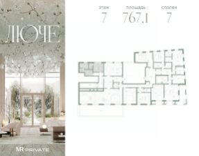 свободной планировки квартира общей площадью 767.13 м² в фамильном доме Люче, расположенная на 7 этаже 7-этажного дома. Люче — Клубный дом в самом сердце исторической Москвы, в охранной зоне Кремля. Уникальный фамильный дом предлагает 43 квартиры, площадью от 79 до 384 м², спроектированные для тех, кто ценит приватность, пространство и изысканность. Дизайн и архитектура Архитектурная концепция Клубного дома Люче была разработана в известном итальянском бюро Archea Associati, основанном Марко Казамонти во Флоренции в 1988 году. Каждая деталь в Люче продумана до мелочей, чтобы обеспечить резидентам максимальный комфорт и эстетическое удовольствие. Центральное гранд-лобби с потолками высотой 9 м — просторное помещение, объединяющее три входные группы, западное лобби с музыкальной гостиной и восточное с библиотекой. Благоустройство и инфраструктура Главное сокровище Люче — секретный сад. Тихие тропинки вьются между тенистыми пространствами, создавая множество уютных уголков для отдыха и размышлений. Прогулка по тенистым аллеям сада становится своего рода медитацией, которая помогает восстановить силы и зарядиться энергией на новый день. Не покидая территорию своего дома, резиденты Люче могут пользоваться эксклюзивными пространствами и сервисами: beauty-кабинет; зал для фитнеса и йоги,детская игровая комната, кабинет для индивидуальных занятий с репетитором, переговорная. Инженерные решения В каждой квартире предусмотрены: индивидуальные системы приточно-вытяжной вентиляции с очисткой воздуха и кондиционирования; система увлажнения воздуха; очистка и умягчение воды; система бесперебойного горячего водоснабжения; система "Умный дом": управление климатом, освещением, шторами, системой защиты от протечек, возможность установки дополнительных сервисов,а также, подогрев террас и балконов. Для всего дома предусмотрено усиление сигнала сотовой связи и wi-fi на территории всего дома, в том числе в саду и паркинге; бесшумные лифты с дизайнерской отделкой; подогрев покрытий входных групп; -вакуумное мусороудаление. Безопасность обеспечивают камеры круглосуточного видеонаблюдения, установленные по всему комплексу здания и на территории, а также автоматическая система распознавания госномера при въезде в паркинг. Паркинг Одноуровневый паркинг имеет увеличенные габариты машиномест. Здесь предусмотрены места для зарядных станций повышенной мощности, благодаря которым электрокар можно зарядить всего за 20 минут.