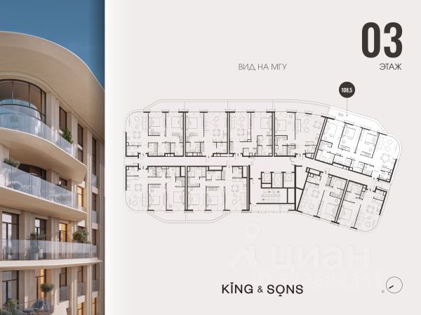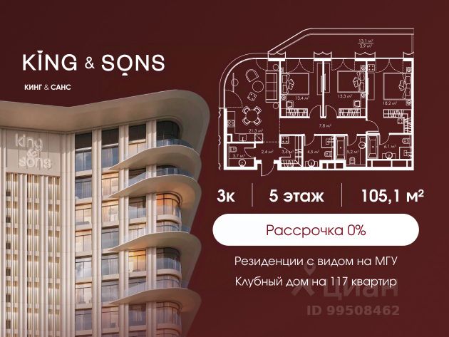 КИНГ энд САНС это клубный дом на 117 резиденций премиум-класса, расположенный на престижной и исторической улице Мосфильмовская. Из большинства квартир открываются панорамные виды на МГУ, "Москву-Сити", особняки посольств и парки. Это место для тех, кто не хочет выбирать между комфортом мегаполиса и уединением на природе. Проект разработан международным архитектурным бюро, которое входит в ТОП-2 в мире. Фасады из натурального камня, мягкие формы здания, максимально открытое остекление, окна в пол — все это делает облик здания выразительным и уникальным. В проекте предусмотрено 70% квартир с террасами. Потолки от 3,2 до 4,7 м. Паркинг на 110 машиномест. Для будущих резидентов продуманы разнообразные общественные пространства зимний сад в лобби первого этажа, секретный сад с зоной открытого огня, лаундж-зона с кинотеатром на крыше, собственный спортзал, зоны для занятий йогой и медитацией. КИНГ энд САНС это фамильная недвижимость, которую с гордостью передают по наследству Купить квартиру первичка на улице Мосфильмовская в Москве.