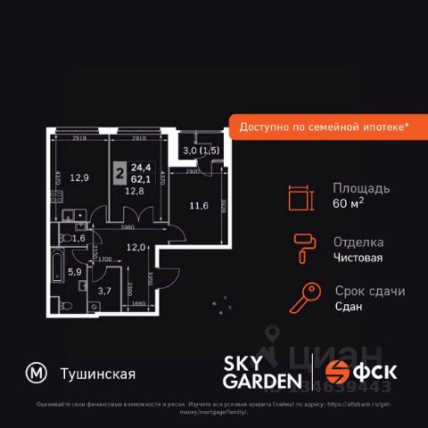 Прямая продажа от застройщика! Жилой Комплекс бизнес-класса. Продаётся 2-к квартира номер 443 общей площадью 61.6 кв.м. на 14-м этаже 28 этажного здания. Чистовая отделка. Цена с учётом скидки. Особенности квартиры: - Организуем показ в удобное для вас время! - Мастер-зона с гардеробной. Просторное место для отдыха и удобного хранения вещей. - Распашная планировка - отличное сочетание удобства и свободы. - Увеличенная ширина окна/окон - больше света и визуального простора. - Постирочная - организуйте пространство для стирки и сушки вещей. - Раздельный санузел - больше удобства для всех членов семьи. - Гибкая планировка - создайте пространство по своему вкусу. - Место для игры/занятия спортом - идеальное пространство для активных детей. - Можно оборудовать 2 или более рабочих места - пространство для нескольких человек. - Можно оборудовать рабочее место - комфорт для работы и учёбы. - Просторная мягкая зона - комфорт и уют для отдыха всей семьи. - Линейная кухня - функциональность и практичность в одном решении. - Ниша под шкаф - компактное и удобное место для вещей. - Лоджия - уютное место для отдыха и тишины. Квартира с чистовой отделкой. Раскройте свою индивидуальность в создании своего уникального проекта, а трудоемкий ремонт мы возьмем на себя! Вы идете в ногу со временем и предпочитаете современные, универсальные дизайнерские решения? Или вы любитель строгой лаконичной классики? Тогда наши интерьеры придутся вам по душе! Выбирайте то, что ближе лично Вам и реализуйте свои задумки вместе с нами! Информация о комплексе: ЖК "Скай Гарден" в Покровском-Стрешнево: гармония природы и мегаполиса. Живите среди зелени одноимённого парка, рек и каналов с чистым воздухом, сохраняя все преимущества городской инфраструктуры. Идеальный баланс для тех, кто ценит природу без компромиссов в комфорте. Транспортная доступность: Всего в 12 минутах пешком до м. Тушинская и 15 минутах до станции Тушинская МЦД. На автомобиле: 2 км до Волоколамского шоссе, 2,5 км до МКАД и 15 км до Садового кольца Внутренняя инфраструктура: К вашим услугам игровые площадки для детей с горками и фонтанами. Йога на газоне, воркаут, велопарковки. На территории: поликлиника, аптека, супермаркет, зоны отдыха. Игровая комната в лобби, хранилище для велосипедов в подъездах. Рядом: кафе, пекарня, мастерские, секции. Парк 3,5 га с набережной для прогулок. Всё для жизни и спорта в шаговой доступности. Квартира с чистовой отделкой: ваш стиль без ремонта. Выбирайте современный дизайн или классику - мы воплотим ваши идеи. Готовые интерьеры для уникального дома.