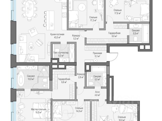 Роскошный двухэтажный пентхаус с эксклюзивными завораживающими видами. Продуманная и изысканная планировка позволяет воплотить самые смелые дизайнерските идеи и создать светлое и объёмное пространство с разнообразными сценариями жизни. Из панорамных арочных окон открывается прямой вид на Спасскую башню Кремля и Куранты. Потрескивание дров в гостиной наполнит зимние вечера теплом и уютом.
