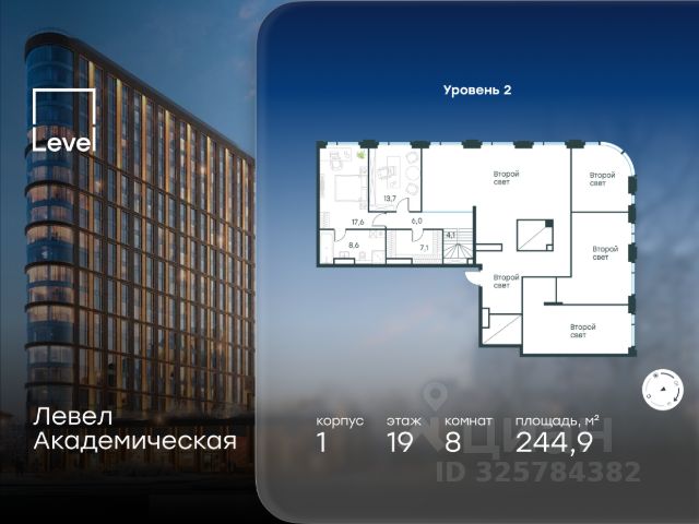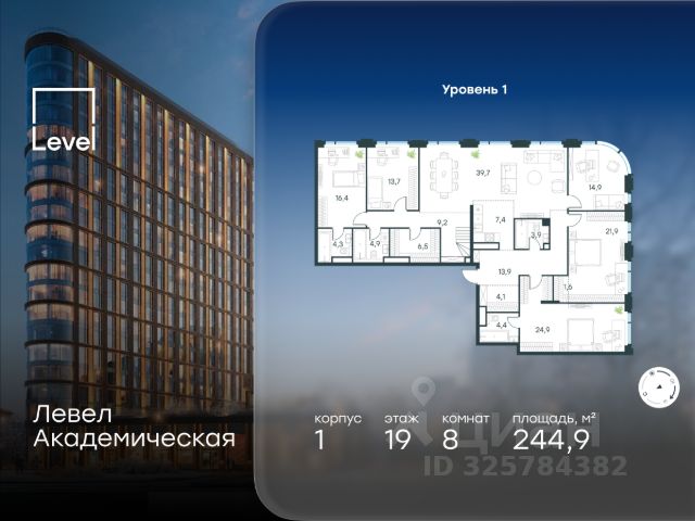 Цена указана с учётом скидки при 100%-й оплате, несубсидированной ипотеке, рассрочке (кроме программы "Рассрочка 0%"). В Академическом районе продаётся квартира-студия площадью 24.90 кв.м без отделки. Квартира расположена на 13-м этаже 19-этажного жилого комплекса бизнес-класса Левел Академическая (компания Level Group). Площади помещений определены кадастровым инженером по результатам обмеров. Отличная транспортная доступность: - 1 мин. пешком до станции метро "Академическая"; - 4 мин. на автомобиле до ТТК; - 8 мин. на автомобиле до Садового кольца; - 13 мин. на автомобиле до Кремля. Продуманный архитектурный проект: - современная архитектура от бюро UNK project; - высокие потолки в квартирах до 6,62 м; - окна в пол высотой 2,5-2,68 м с панорамным видом на МГУ, Москва-Сити и другие доминанты Москвы; - квартиры с моллированным остеклением - радиусные окна открывают увеличенный угол обзора; - более 20 вариантов планировочных решений; - уникальные квартиры с собственным патио и возможностью обустройства дровяного камина; - квартиры сдаются без отделки, что открывает свободу для создания интерьера по своему вкусу. Расположение: Камерный проект из 1 корпуса расположен тихом зеленом районе Москвы, в непосредственной близости к центру города. В округе построено 80 детских садов, 50 школ и 30 вузов, 7 из которых входят в топ100 вузов России: МГУ, МГИМО, РАНХиГС, МИСИС, РУДН, РЭУ им. Плеханова и РГУ нефти и газа им. Губкина. Этот район буквально утопает в зелени парков, начиная с уютного Академического в 6 минутах пешком и заканчивая одним из крупнейших в городе парком 50-летия Октября (12 минут на автомобиле). Общая площадь природных объектов в радиусе 2-6 км от дома - 476,5 га. Внутренняя инфраструктура: На территории жилого комплекса Левел Академическая откроется собственный торговый центр, а для отдыха жителей будут созданы общественные пространства: комфортное лобби с дизайнерской отделкой, окнами в пол и потолками высотой 4,5 м, а также две благоустроенные зоны - территория по периметру здания и пространство на стилобате. Во дворе на стилобате предусмотрены детская и спортивная площадки, коворкинг и лаунж-зона на открытом воздухе. Стилобат украсят скульптуры животных - жирафа, зайца и волка, которые станут ярким акцентом внутреннего двора жилого комплекса Левел Академическая, подчеркивая близость к музею Дарвина. Процент озеленения территории - 58%. Технологии и безопасность: Жителей жилого комплекса Левел Академическая не коснется ежегодное отключение горячей воды благодаря собственным центральным водонагревателям. Безопасность гарантирует круглосуточная охрана, безлимитный Wi-Fi, круглосуточное видеонаблюдение. Удобное перемещение внутри комплекса будут обеспечивать 5 лифтов с доступом в паркинг с жилых этажей.
