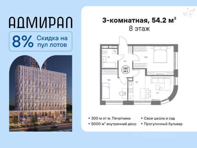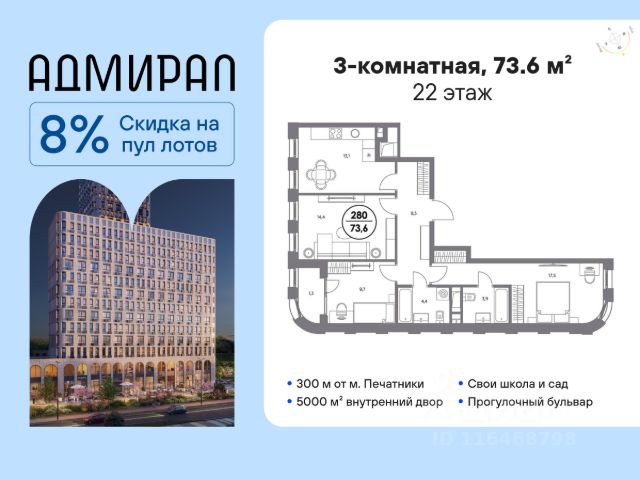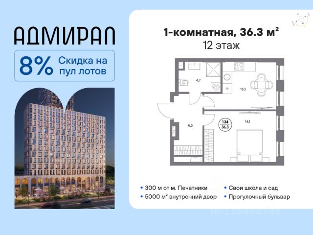 В динамично развивающемся районе Москвы, всего в 300 метрах от метро и в пешей близости от нового городского порта с протяженной набережной 13 км, свободной от автомобилей, продается 1-комнатная квартира площадью 36.30 м². без отделки. Квартира находится в корпусе жилого комплекса бизнес-класса "Адмирал", расположенного по адресу г. Москва, ул. Шоссейная, 4Д. (Застройщик - "Галс Девелопмент"). Новый амбициозный проект "Адмирал" станет частью одного из самых перспективных районов будущего - "Сити-2". В пешей доступности от современных башен Вас ждут живописные Люблинские пруды, 2 усадьбы с уникальной историей и уютный парк "Печатники" у Перервинского плёса. Район имеет отличную транспортную доступность: • 300 метров до станции метро "Печатники"; • Удобная пересадка на БКЛ и станцию МЦД-2; • 10 минут на машине до ТТК; • 15 минут до Садового кольца. Архитектура корпусов отличается динамичностью облика благодаря переменной этажности: высокие башни сочетаются с домами средней этажности. Изящным украшением становятся арочные витражи. Интеллигентный и современный стиль "Адмирала" продолжается в гранд-лобби: пастельные оттенки интерьера и фактурные элементы декора создают атмосферу безмятежного отдыха, особое ощущение простора дарят высокие потолки до 4 м и витражные окна. В домах предусмотрено от трех до шести скоростных лифтов, каждый из них спускается на любой этаж подземного паркинга и обладает удобными сенсорными панелями управления и низким уровнем шума. Благоустроенный двор площадью 5000 кв.м. украсят десятки видов гипоаллергенных растений. Здесь можно совершить приятный променад, по пути заглядывая за свежезаваренным кофе, уединиться за ноутбуком в комфортном коворкинге, занять ребенка играми в двухъярусном плейхабе или помедитировать на специальной площадке для йоги. Мягкий свет декоративных фонарей подчеркнет живописность местности, а чувство безопасности гарантируют круглосуточные системы видеонаблюдения. Дополнительные преимущества: • Высокие потолки от 2,9 до 3,25 м; • Бизнес-центр, школа и детский сад прямо на территории дома; • Подземный двухуровневый паркинг на 1955 машино-мест; • Кладовые помещения в тёплом контуре на 2м этаже; • Стрит-ритейл на первых этажах.