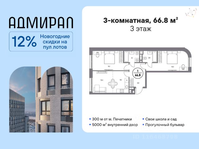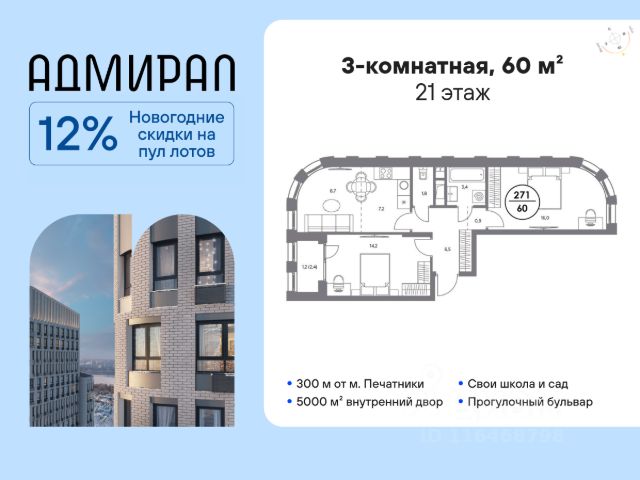 В динамично развивающемся районе Москвы, всего в 300 метрах от метро и в пешей близости от нового городского порта с протяженной набережной 13 км, свободной от автомобилей, продается 3-комнатная квартира площадью 60.00 м². без отделки. Квартира находится в корпусе жилого комплекса бизнес-класса "Адмирал", расположенного по адресу г. Москва, ул. Шоссейная, 4Д. (Застройщик - "Галс Девелопмент"). Новый амбициозный проект "Адмирал" станет частью одного из самых перспективных районов будущего - "Сити-2". В пешей доступности от современных башен Вас ждут живописные Люблинские пруды, 2 усадьбы с уникальной историей и уютный парк "Печатники" у Перервинского плёса. Район имеет отличную транспортную доступность: • 300 метров до станции метро "Печатники"; • Удобная пересадка на БКЛ и станцию МЦД-2; • 10 минут на машине до ТТК; • 15 минут до Садового кольца. Архитектура корпусов отличается динамичностью облика благодаря переменной этажности: высокие башни сочетаются с домами средней этажности. Изящным украшением становятся арочные витражи. Интеллигентный и современный стиль "Адмирала" продолжается в гранд-лобби: пастельные оттенки интерьера и фактурные элементы декора создают атмосферу безмятежного отдыха, особое ощущение простора дарят высокие потолки до 4 м и витражные окна. В домах предусмотрено от трех до шести скоростных лифтов, каждый из них спускается на любой этаж подземного паркинга и обладает удобными сенсорными панелями управления и низким уровнем шума. Благоустроенный двор площадью 5000 кв.м. украсят десятки видов гипоаллергенных растений. Здесь можно совершить приятный променад, по пути заглядывая за свежезаваренным кофе, уединиться за ноутбуком в комфортном коворкинге, занять ребенка играми в двухъярусном плейхабе или помедитировать на специальной площадке для йоги. Мягкий свет декоративных фонарей подчеркнет живописность местности, а чувство безопасности гарантируют круглосуточные системы видеонаблюдения. Дополнительные преимущества: • Высокие потолки от 2,9 до 3,25 м; • Бизнес-центр, школа и детский сад прямо на территории дома; • Подземный двухуровневый паркинг на 1955 машино-мест; • Кладовые помещения в тёплом контуре на 2м этаже; • Стрит-ритейл на первых этажах.