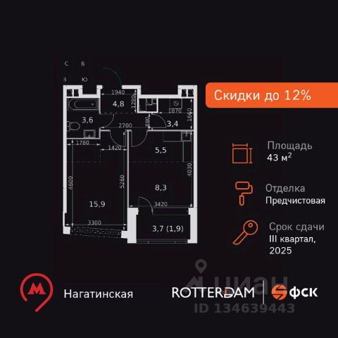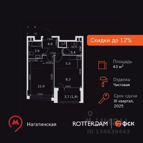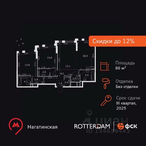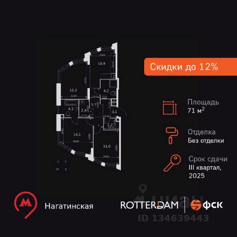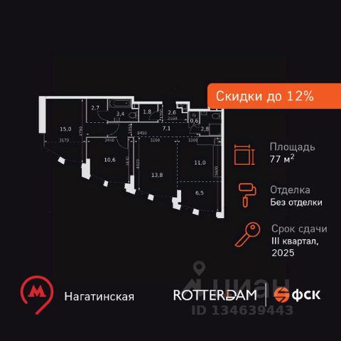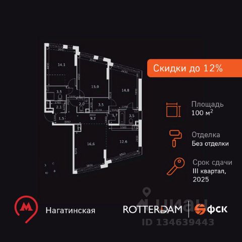 Прямая продажа от застройщика! Жилой Комплекс бизнес-класса. Продаётся 4-к квартира номер 139 общей площадью 100.1 кв.м. на 20-м этаже 29 этажного здания. Без отделки. Цена с учётом скидки. Особенности квартиры: - Мастер-зона с гардеробной. Просторное место для отдыха и удобного хранения вещей. - Мастер-зона с санузлом. Уют и комфорт в одном пространстве. - Угловая планировка - больше пространства для ваших идей. - Мало квартир на этаже - уединение и тишина. - Окно в ванной - натуральное освещение для уюта и комфорта. - Увеличенная ширина окна/окон - больше света и визуального простора. - Увеличенное количество окон - дополнительное освещение и свежий воздух. - Угловое остекление - свет и воздушность в каждой комнате. - Гостевой санузел - комфорт и удобство для ваших гостей. - Душ помимо ванной - дополнительное удобство для вашей семьи. - Постирочная - организуйте пространство для стирки и сушки вещей. - Гибкая планировка - создайте пространство по своему вкусу. - Место для игры/занятия спортом - идеальное пространство для активных детей. - Просторная мягкая зона - комфорт и уют для отдыха всей семьи. - Возможность добавить спальное место - дополнительный комфорт для гостей. - Гардеробная - удобство для хранения и организации вещей. Информация о комплексе: В ЖК Роттердам отличное расположение, которое позволит вам выбирать свой сегодняшняшний маршрут и транспорт исходя из настроения, целей и погоды. Отсюда удобно добираться в центр как на метро станция находится в пешей доступности, так и на автомобиле. Варшавское шоссе связывает жилой комплекс с ТТК, а через Люсиновскую и Мытную улицы с Садовым кольцом. В качестве альтернативного маршрута можно использовать Нагатинскую набережную: дорога вдоль Москва-реки приведет к Кремлю и Павелецкому вокзалу. Для неспешной поездки предусмотрены трамвайные маршруты, а в теплое время года веломаршруты вдоль реки. Транспортная доступность: Всего в 5 минутах пешком до метро Нагатинская и 8 минутах от МЦК Верхние Котлы. Рядом Аэроэкспресс до метро Домодево. До ТТК 2,2 км и 4,9 км до Садового кольца. Внутренняя инфраструктура: Если вы ищете идеальный баланс между отдыхом и работой и обладаете активной жизненной позицией - ЖК Роттердам вам понравится. В ЖК: зоны коворкинга, плейхаб и детские площадки для отдыха всей семьей. Близость к деловому центру Москвы, в окружении 5 парков, рядом спортивные и развлекательные центры Если вы любите живописные виды и долгие прогулки - ЖК Роттердам - отличный вариант для вас, так как он расположен прямо на Нагатинской набережной с выходом на Москву реку! В ЖК Роттердам соблюден баланс между высоткой и малоэтатажным зданием, которое не потеряло ощущение уюта и не создает впечатление городских джунглей Если вы любите быть на высоте и без ограничений - выбирайте верхние этажи Для тех, кто ценит комфорт и собственное время Для тех, кто ценит комфорт и личное пространство Для тех, кому важен комфорт, безопасность и личное пространство на