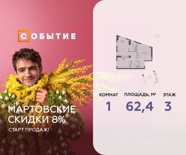 Весь март - скидка до 8% действует до 31.03.2026 г. при 100% оплате и не субсидированной ипотеке! В продаже 1-к квартира от застройщика. Общая площадь 45.9, жилая 27.9, кухня 18. Квартира расположена на 2 этаже жилого квартала "Событие-6", корпус 1, Секция 1. Квартира без отделки. Срок сдачи: 4 кв. 2029 года. СОБЫТИЕ.6 — финальный дом парк-квартала СОБЫТИЕ на Мосфильмовской. Переезжайте в уже сформированный квартал с готовой инфраструктурой и парком! Премиальный жилой комплекс в престижном районе Москвы предлагает стильную архитектуру, продуманное благоустройство и великолепно разнообразие общественных пространств. Свой парк прямо возле дома! Архитектура Архитектура СОБЫТИЯ.6 выполнена в ультрасовременном стиле московским бюро Atrium на основе дизайн-кода британских архитекторов LDA Design и UHA London. Дом отличает оригинальная геометрия фасадов, большое остекление и высокие лобби (до 6,2 м) с авторской мебелью и светильниками. Расположение Мосфильмовская улица (Раменки) — один из престижных районов Москвы. Близость к историческому и деловому центру, природным зонам Запада столицы. Транспортная доступность: • 10 мин до Москва-Сити и ТТК; • 15 мин до Садового кольца; • 25 мин до аэропорта Внуково; • 7-10 мин до станций метро "Аминьевская" и "Мичуринский проспект". Инфраструктура: • парк "Событие" (12 га, финалист конкурса Правительства Москвы) с беговыми (1,5 км) и велодорожками (2,7 км), экотропой (1,6 км), площадками, лекторием; • школа, детский сад, магазины, салоны красоты, рестораны (к моменту заселения); • мультидвор с игровыми и спортивными площадками, мини-бульваром; • общественная терраса на 10-м этаже (коворкинг, лаунж); • Закрытые общественные пространства: детская комната, спортивный зал, коворкинг, лаунж-зоны. Паркинг 256 мест для жителей (48 — для электромобилей), 24 гостевых (5 — для электромобилей), мойки колес, кладовые, зоны для велосипедов. Окружение Парки и заповедники (Воробьёвы горы, Матвеевский лес и др.), МГУ, театр им. Н. И. Сац, стадион "Лужники". Безопасность Видеонаблюдение, контроль доступа, видеодомофоны, консьерж-сервис 24/7, системы пожарной безопасности и мультисервисная оптическая сеть.