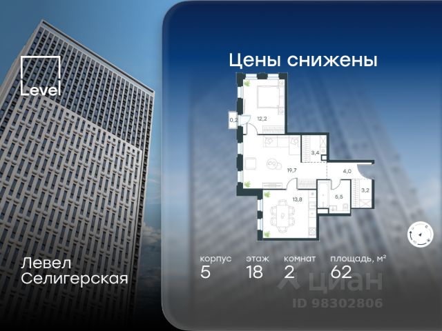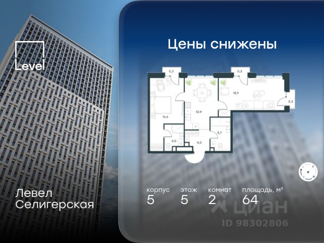 Цена указана с учётом скидки при 100%-й оплате, несубсидированной ипотеке, рассрочке (кроме программы "Рассрочка 0%"). В жилом квартале, расположенном в южной части района Западное Дегунино, продаётся 2-комнатная квартира площадью 55.50 кв.м без отделки. Квартира расположена на 7 этаже 40-этажного корпуса 5 в жилом комплексе комфорт-класса Левел Селигерская (компания Level Group/Левел групп). Отличная транспортная доступность: - 10 мин. пешком до станции метро "Верхние Лихоборы"; - 15 мин. пешком до станции метро "Селигерская"; - 20 мин. пешком до станции МЦД-3 "Моссельмаш"; - 11 мин. на авто до МКАД; - 13 мин. на авто до ТТК; - 16 мин. на авто до Садового кольца. Расположение Район отличается богатой социальной инфраструктурой: школы, детские сады, поликлиники, магазины, фитнес-клубы, торговые центры - всё близко к дому. Рядом с Левел Селигерская расположено 5 парковых зон. В 3 минутах от дома расположен перспективный сквер-парк. В 10 минутах пешком находится парк им. Святослава Фёдорова, в 13 минутах на велосипеде - парк "Ангарские пруды". В 7-11 минутах на автомобиле - два крупных природных объекта: Тимирязевский парк и Главный ботанический сад Российской академии наук. Благоустройство Внутренние дворы жилого комплекса огорожены от машин, а их функциональное наполнение отличается в зависимости от очереди строительства. На территории 2-й очереди жителей ждут уютные навесы с качелями, павильон-читальня, волейбольная площадка, беседки, а также детские и спортивные площадки. Технологии и инженерия Для входа на территорию комплекса предусмотрен единый ключ доступа. Все общественные зоны оснащены камерами видеонаблюдения, по заявке собственнику предоставляется возможность просмотра изображения отдельных видеокамер на его мобильном устройстве. При въезде в паркинг функционирует система распознавания госномеров. Кроме того, для комфорта жителей создано мобильное приложение, с помощью которого можно удаленно контролировать доступ на придомовую и жилую территории. Другие преимущества жилого комплекса - Высокая освещённость квартир: в большинстве из них не менее трёх окон; - Супермаркет, магазины, кафе, пекарни и многое другое на первых этажах домов; - Частный детский сад; - Стильные дизайнерские лобби с высокими потолками до 4,3 м. и окнами в пол, для питомцев предусмотрена лапомойка; - 30+ планировочных решений: от компактных студий до просторных семейных квартир; - С каждого этажа дома на лифте можно спуститься в подземный отапливаемый паркинг."
