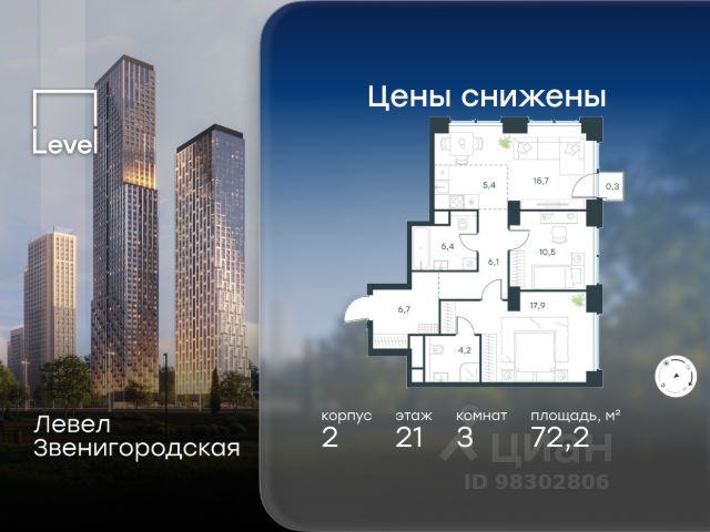 Цена указана с учётом скидки при 100%-й оплате, несубсидированной ипотеке, рассрочке (кроме программы "Рассрочка 0%"). В жилом квартале продаётся 2-комнатная квартира площадью 53.50 кв.м без отделки. Квартира расположена на 18 этаже 64 этажного корпуса 2 в жилом комплексе комфорт класса Левел Звенигородская (компания Level Group/Левел групп). Отличная транспортная доступность - 5 мин. пешком до метро "Звенигородская" (откроется к окончанию строительства); - 18 мин. пешком до станции МЦК "Хорошёво" и станции БКЛ "Народное ополчение"; - 4 мин. на авто до ТТК; - 8 мин. на авто до Садового кольца; - 15 мин. на авто до Кремля. Продуманный архитектурный проект - Концепция от студии Станислава Михаловского, в основу которой легло единение природы и города; - Двухкамерные стеклопакеты в окнах, алюминиевый и ПВХ профиль - в квартирах тепло зимой и прохладно летом; - С верхних этажей открываются панорамные виды на город, Москву-реку, "Москва-Сити" и Москворецкий парк; - Лобби со всеми удобствами: окна в пол, высокие потолки до 4,7 м, лаунж-зоны, колясочные, гостевые санузлы и мойки для лап животных; - Централизованные водонагреватели гарантируют круглогодичную подачу горячей воды в каждую квартиру. Благоустройство Концепция благоустройства разработана совместно с бюро UNK landscape. Высота башен приближается к 200 метрам - они словно касаются неба. Небесный простор проецируется на территорию двора с помощью подсветки, визуально увеличивая пространство и отражаясь в авторских элементах архитектуры. На территории площадью 0,45 га расположатся: - "Облако событий" - место встреч и общения; - "Облако спорта" - всё для поддержания себя в форме; - "Облако принятия решений" - пространство для работы на свежем воздухе; - "Облако спокойствия" - для отдыха в тишине природы; - "Облако игр" - площадки для подростков и самых маленьких. Инфраструктура В жилом комплексе откроется 21 коммерческое помещение: продуктовые лавки, кафе, салоны красоты, службы доставки и творческие студии. Этап 1 включает строительство двухуровневого подземного паркинга. Всего здесь расположится 351 машино-место, включая семейные места, и 264 кладовых помещения. В распоряжении жителей развитая инфраструктура района: 15 супермаркетов, 5 спортивных объектов, 9 медучреждений, 7 детских садов, 4 школы, 3 благоустроенных парка - всё в шаговой доступности. Инженерия Комфортное перемещение внутри домов будут обеспечивать надёжные лифты с доступом в паркинг с жилых этажей. В каждом корпусе предусмотрено до шести кабин, включая сервисные лифты. Попасть на территорию комплекса можно только по единому ключу доступа. Видеонаблюдение установлено на входах в подъезды, в лобби, в общих зонах, на въезде в паркинг. Гости смогут связаться с жителями дома через входные видеопанели, а управлять доступом на территорию можно через видеодомофон или приложение на телефоне.