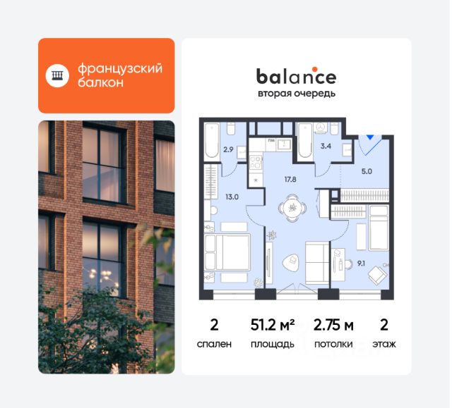 Общая жилая площадь составляет 32,2 квадратных метра, кухня — 8,8 квадратных метров. Особенностью квартиры является просторный балкон, выходящий на две комнаты, который может стать уютным местом для отдыха.